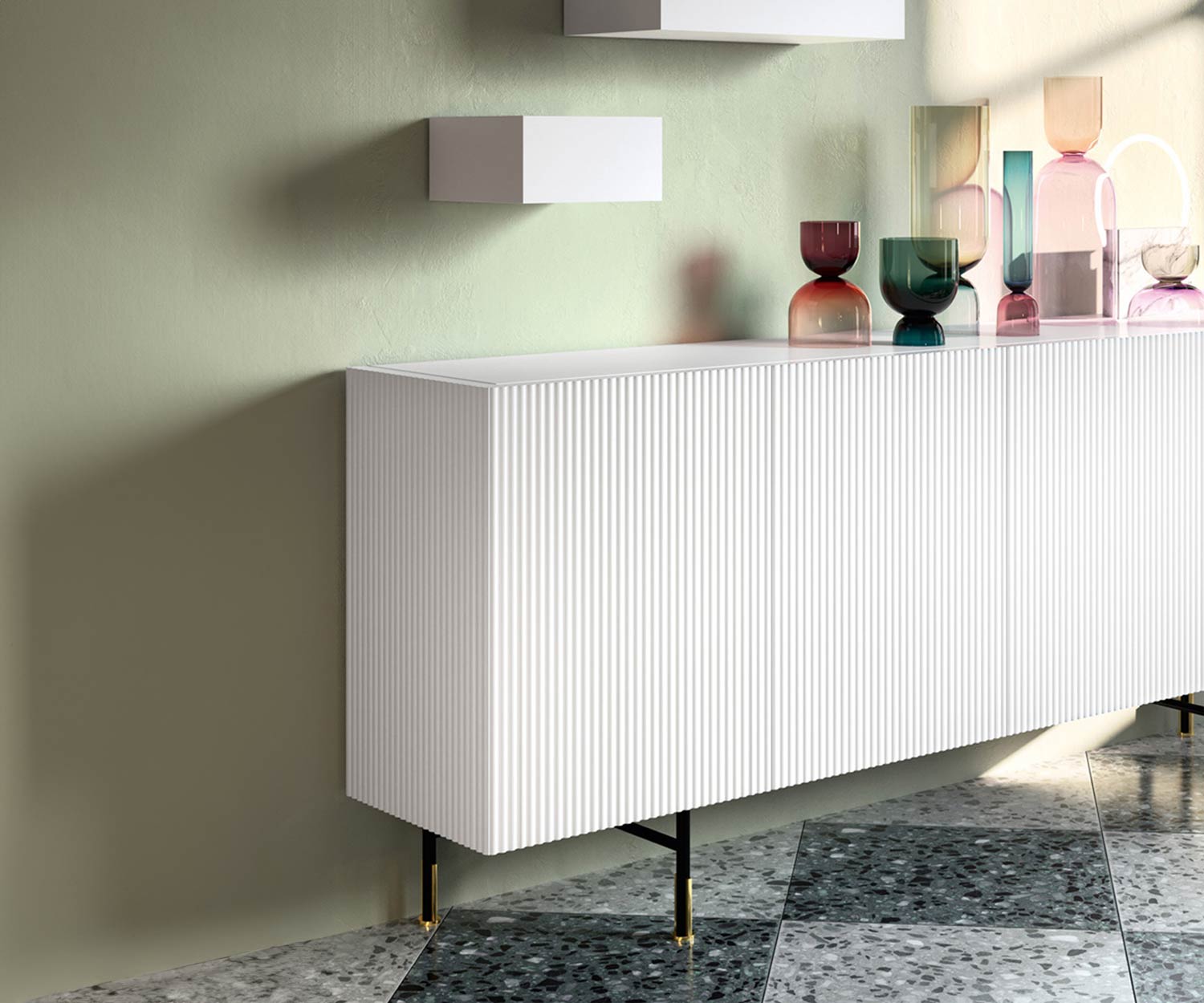 Der Korpus des Capo d´Opera Aero Sideboards ist im Innenkorpus passend zu den Fronten und Außenseiten farbig matt lackiert. Die Türen des Sideboards bestehen aus einer hochwertigen MDF Platte, mit Fronten und Außenseiten im senkrecht geriffeltem Wellenmuster.