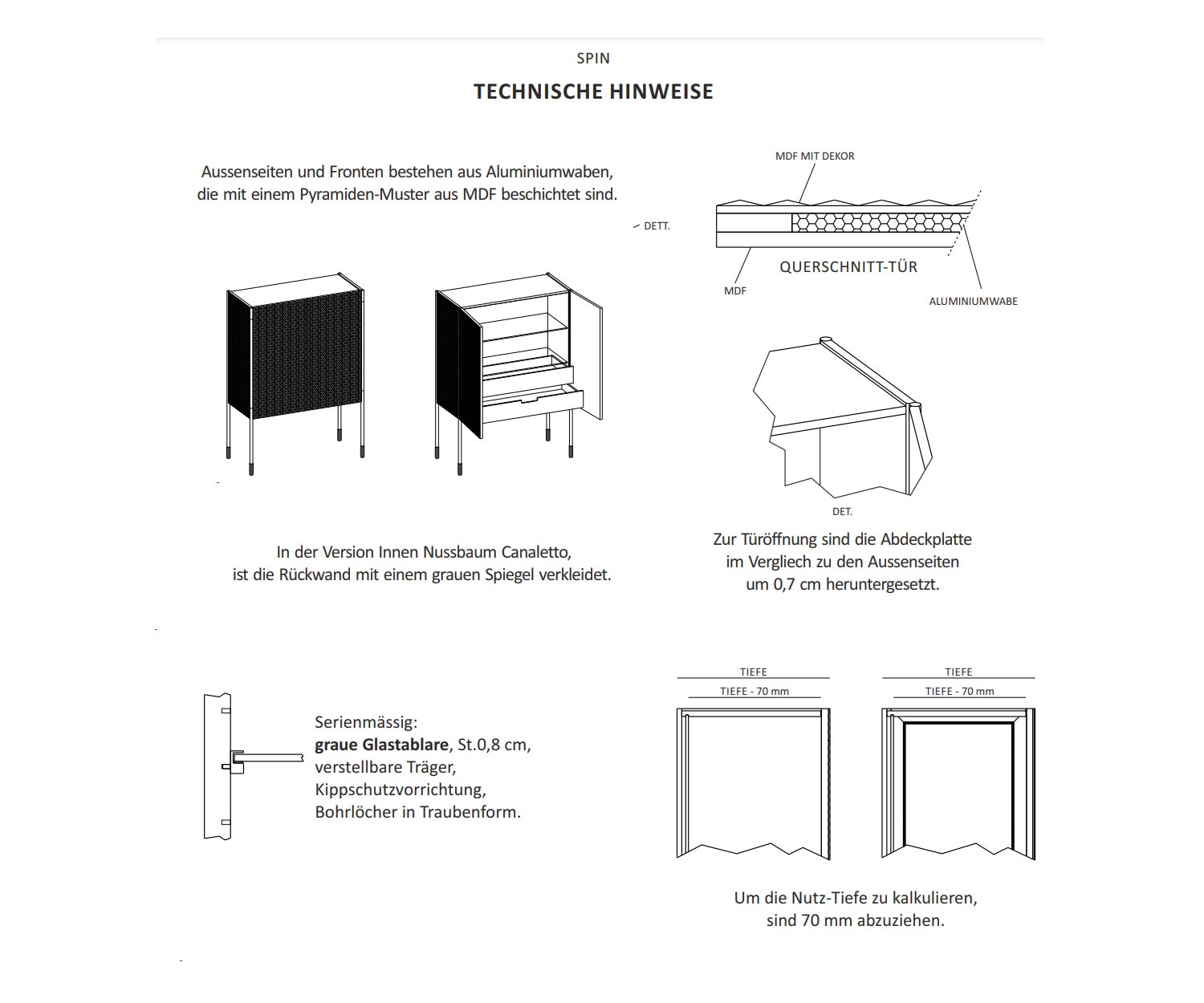 Als Highboard ohne Schubladen mit 2 Drehtüren und 2 Glastablaren (3 Fächer zum Verstauen) - Fronten und Seiten aus MDF Platten mit einem stabilen Aluminium Waben Kern als Außenverkleidung