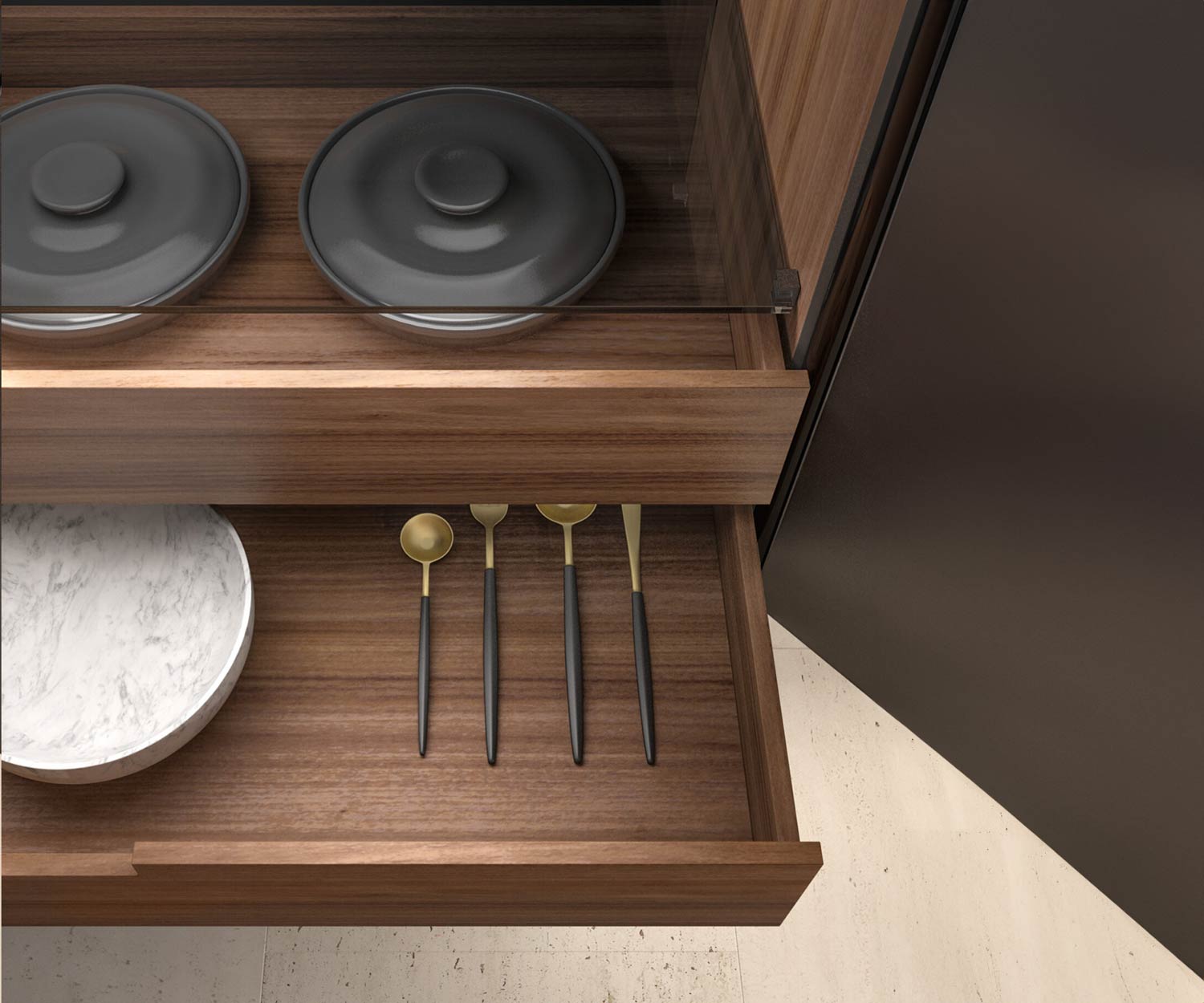 Als Highboard mit 2 Innen Schubladen, 2 Drehtüren und 2 Glastablaren (2 Fächer und 2 Schubladen zum Verstauen) - Fronten und Seiten aus MDF Platten mit einem stabilen Aluminium Waben Kern als Außenverkleidung