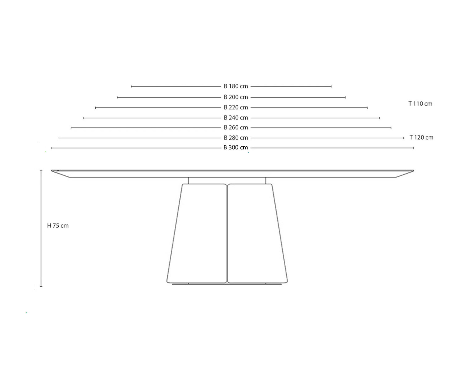 Der tessera 001 Keramik oder Holz Esstisch von al2 ist in 7 unterschiedlichen Breiten erhältlich: