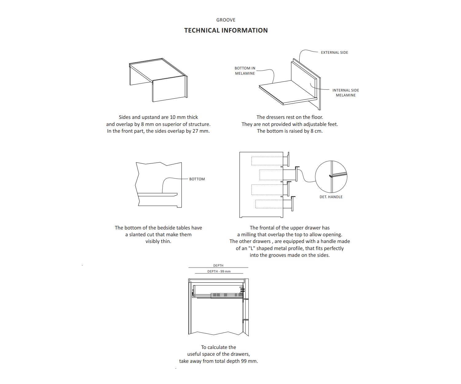 The front panels are fitted with elegant "L" shaped metal handles that fit perfectly into the grooves on the outside for a seamless appearance. Inside, the structures are made of high-quality melamine, which ensures both functionality and durability.