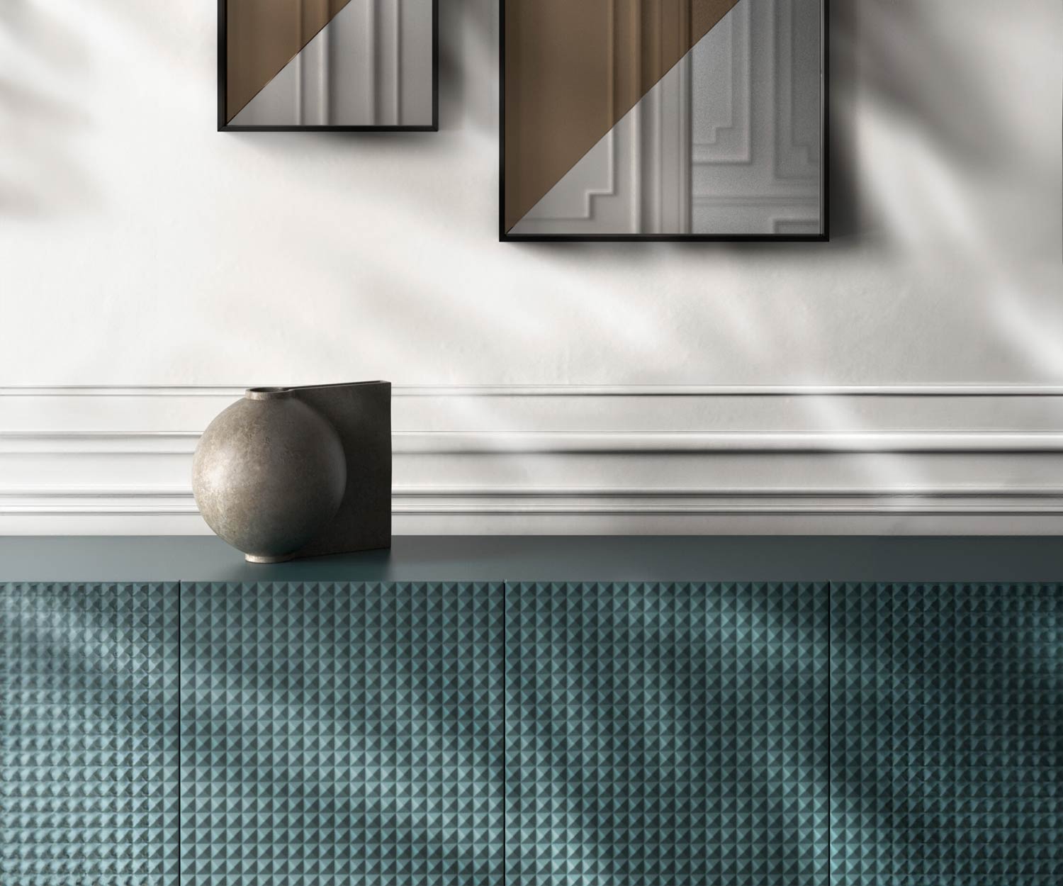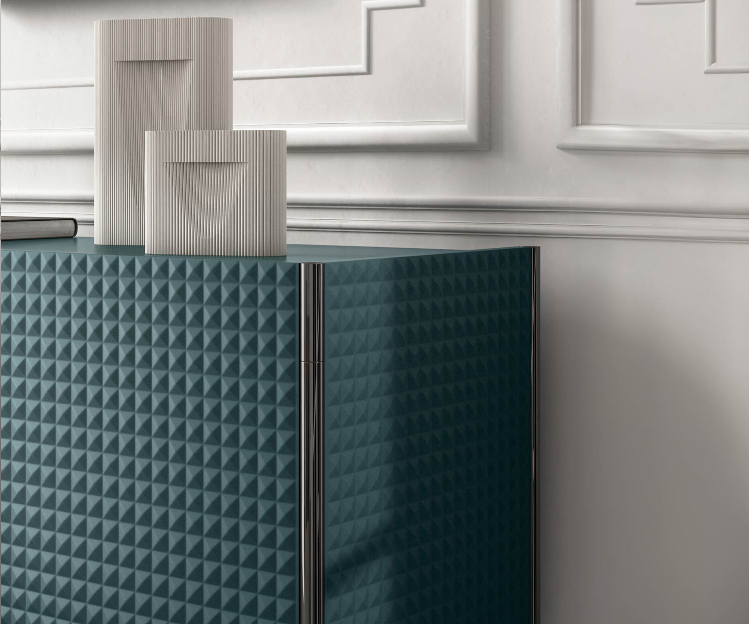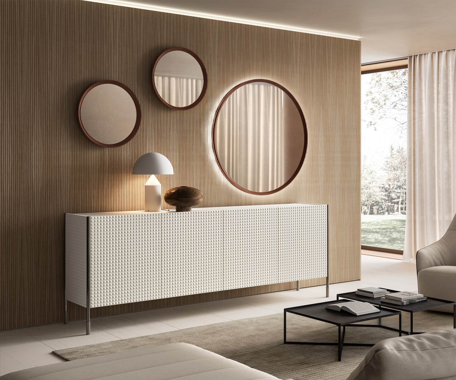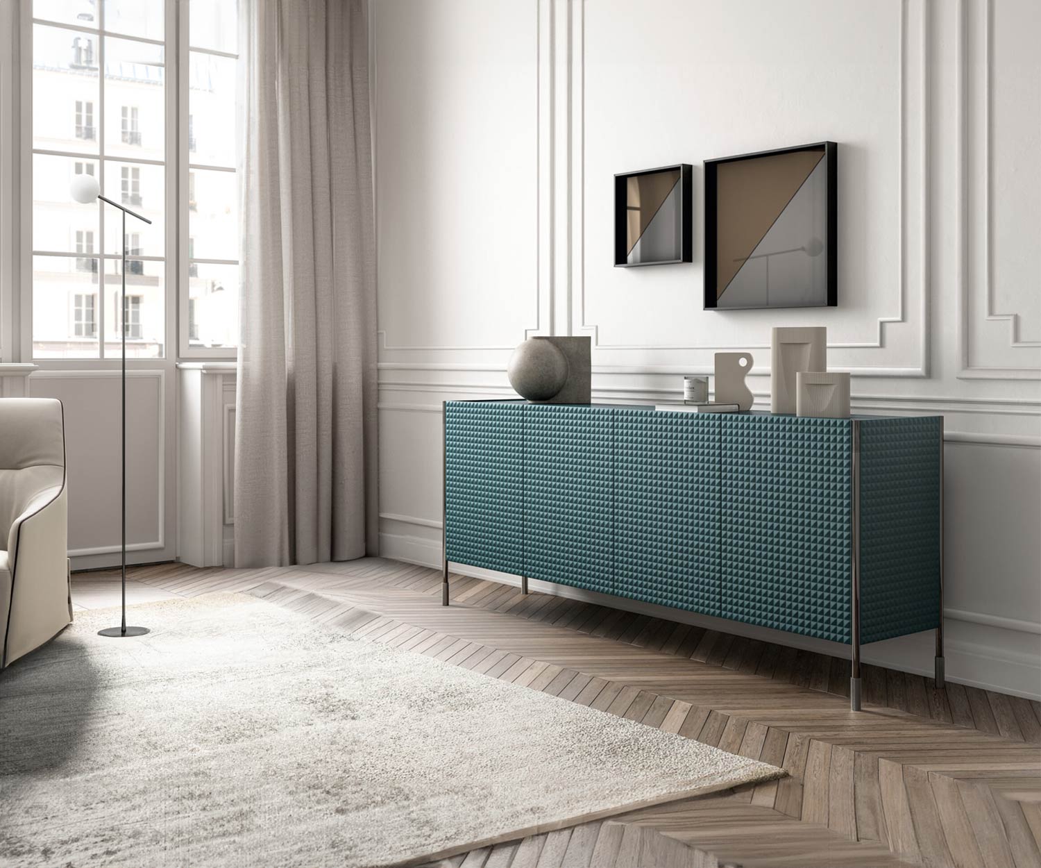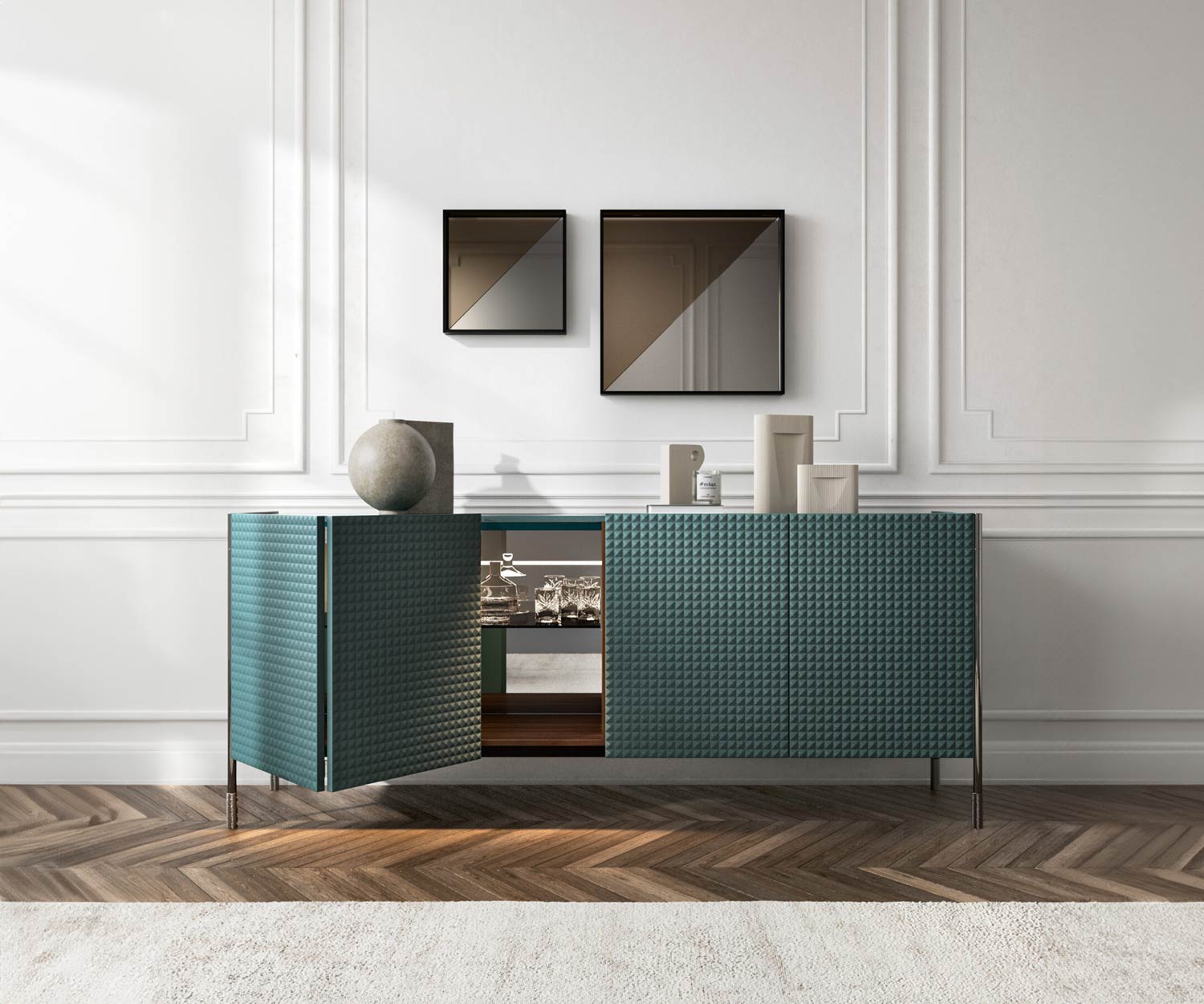 The 4 doors of the Capo d'Opera Spin sideboard consist of 2 folding doors. Simple and straightforward in design, the manufacturer Novamobili has dispensed with handles on this high-quality sideboard, creating a very elegant front.