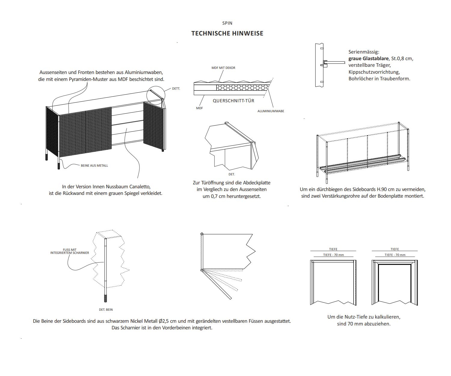 The body of the Capo d'Opera Spin sideboard is matt lacquered on the inside to match the fronts and sides. The doors of the sideboard are made of a high-quality MDF board, with fronts and sides made of a stable aluminium honeycomb core.