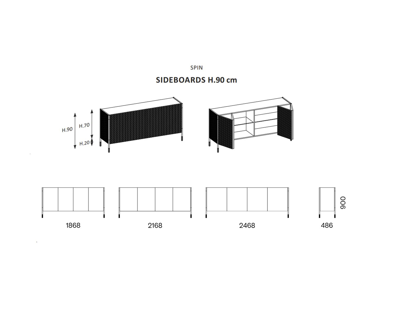 The Capo d'Opera sideboard Spin is available in three different widths: a small, compact 186.8 cm wide version, a slightly larger model with a width of 216.8 cm or the large model with a width of 246.8 cm.