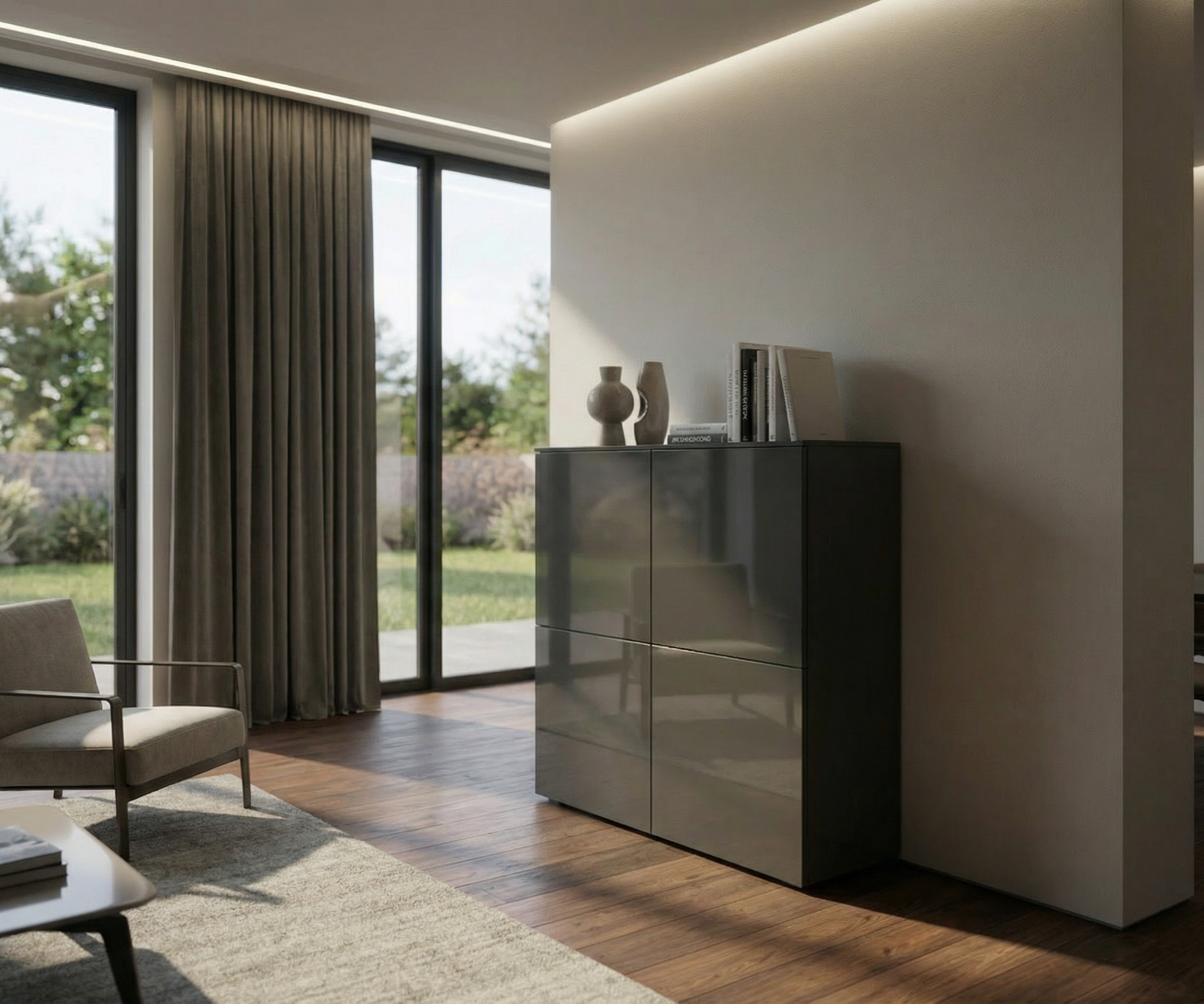 Das Livitalia Design Highboard Four besticht durch minimalistische Eleganz und eine klare Formensprache, die sich nahtlos in moderne Wohnlandschaften einfügt.