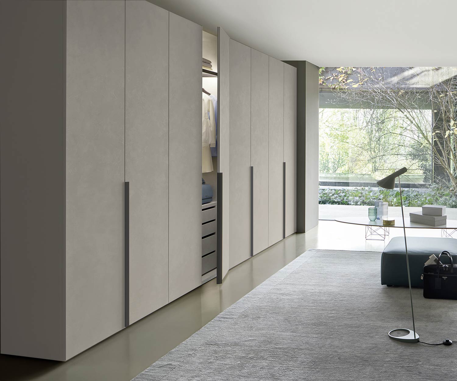 The Livitalia Liscia is a particularly minimalist design wardrobe that stands out with its unusual concrete spatula look. This not only gives the wardrobe a special appearance, but also makes it more resistant to scratches and daily signs of wear.