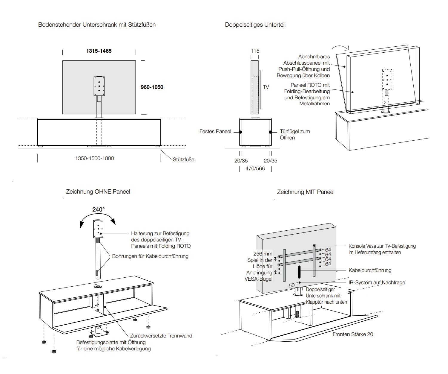 The hinged door can be opened by pressing on the front. Inside there is a partition wall and a tube that connects the cables of the devices inside the lowboard to the TV. The tube is open at the bottom so that cables can be fed into the tube from outside under the lowboard. The TV panel can be rotated by up to 360°. The swivelling TV panel has a width of 115 cm or 146.5 cm and can be fitted with a maximum TV set of up to 50 or 65 inches. A bracket of your choice can be attached to the panel.