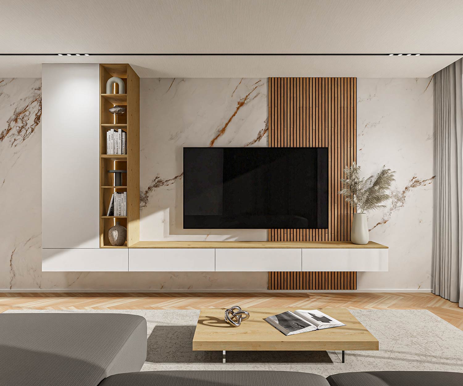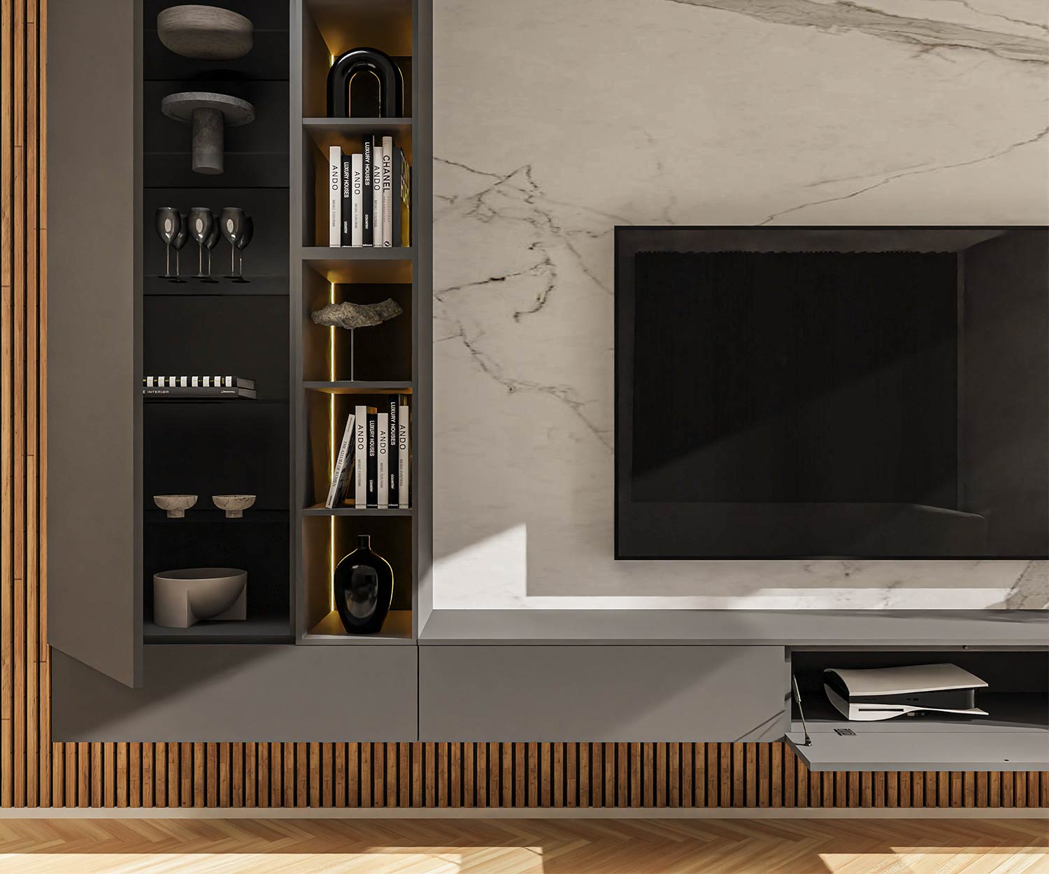 Decorative items, televisions and rear wall panelling are