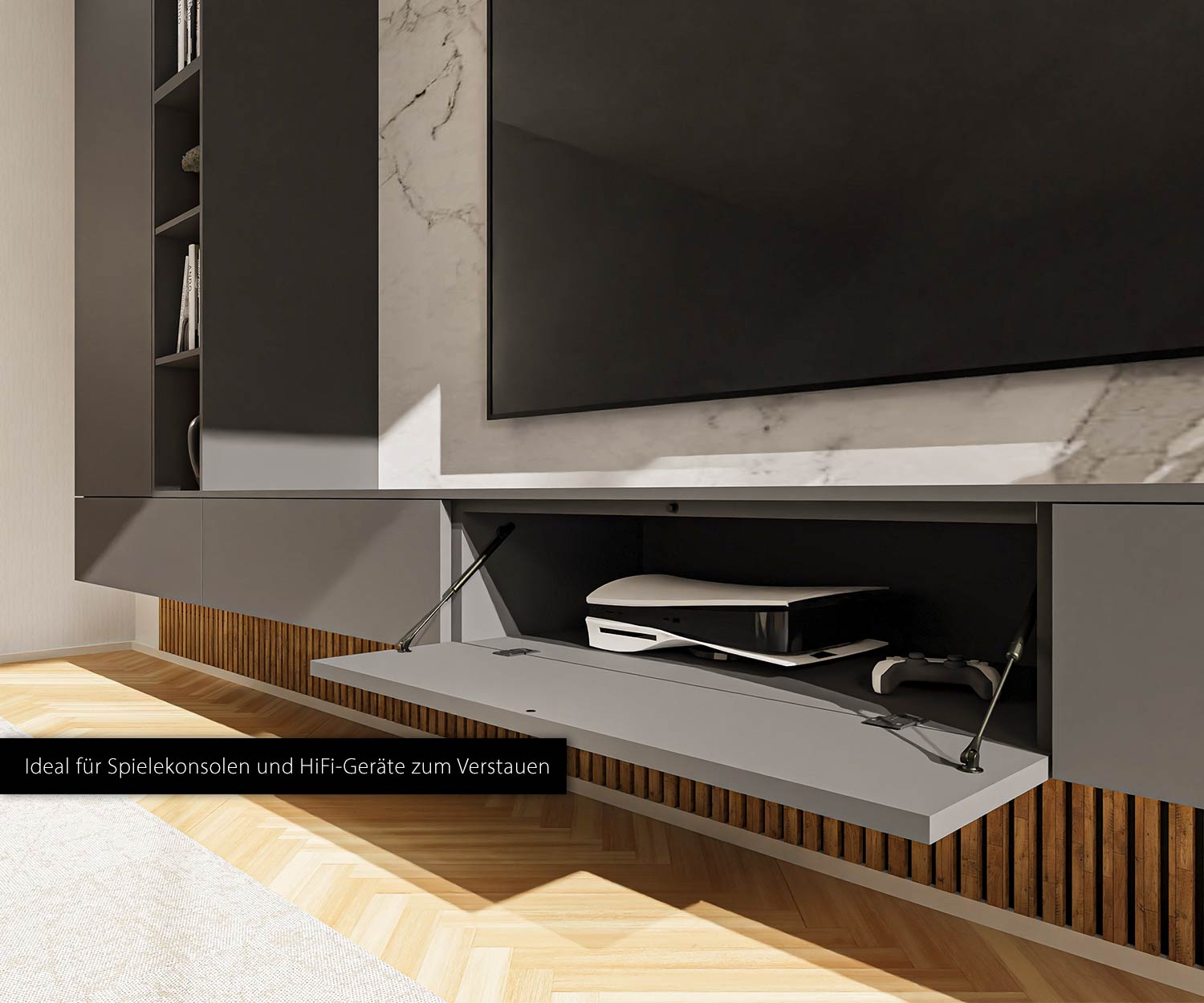 Behind four soft-down flap doors, there is space for a games console, hi-fi equipment or router. or router; cable guides at the back ensure that only the essentials remain visible. only the essentials remain visible. A 60 cm wide larder unit closes to the left above with a handleless hinged door that can hold crockery, glasses or home office documents. or home office documents. Directly next to it, a 30 cm wide, open shelf unit with a warm white warm-white LED strip illuminates glasses, books and accessories in soft 3000 K light. Thus combines practical storage and atmospheric lighting in a calm, harmonious overall a calm, harmonious overall appearance.