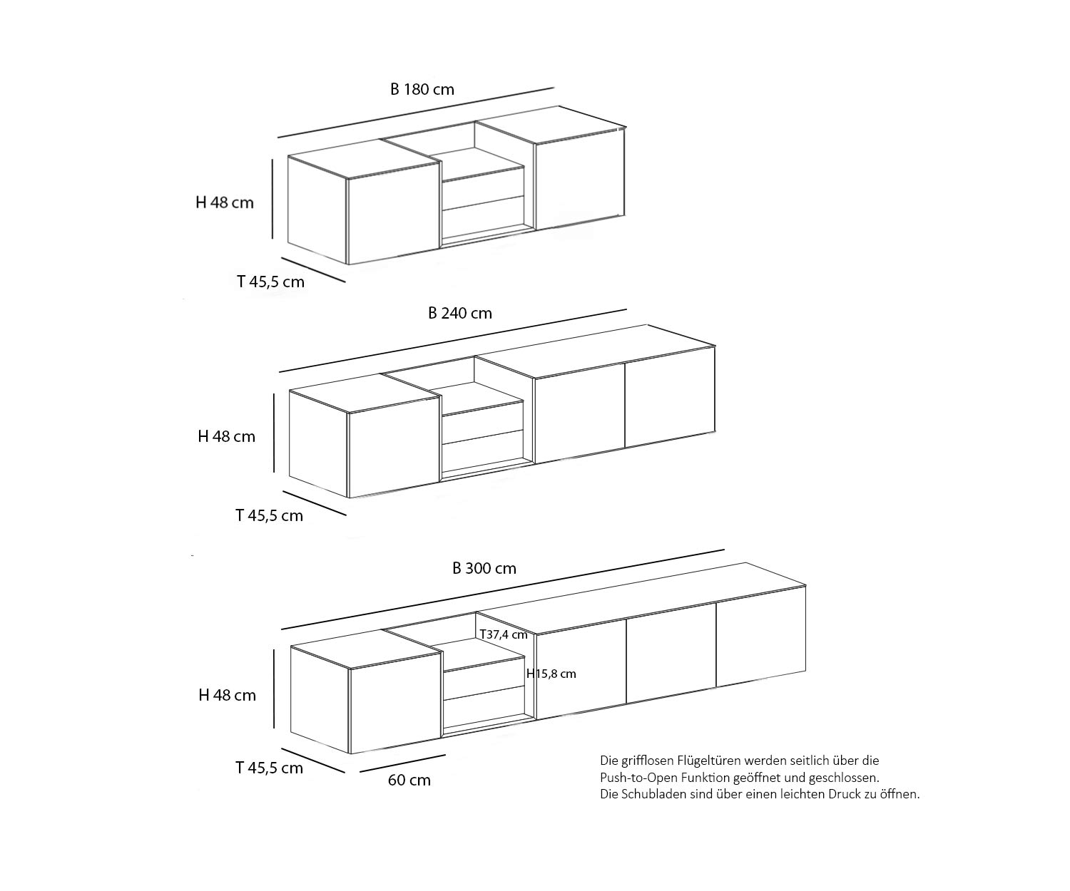 You can order the Novamobili wall sideboard in three different versions : a small, compact 180 cm wide version, a slightly larger model with a width of 240 cm or the Large model with a width of 300 cm. The structure of the cabinet elements can be seen in our sketch. Simple and straightforward in design, the manufacturer Novamobili has dispensed with handles on this high-quality sideboard, creating a smooth, very elegant front. The individual doors can be opened and closed again by pressing lightly on the front.