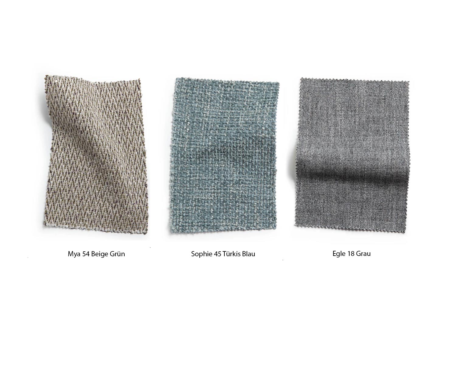 . The upholstery fabric is available in Mya Beige Green, Sophie Blue and Egle Grey. Simply select your preferred colour in the configuration menu.