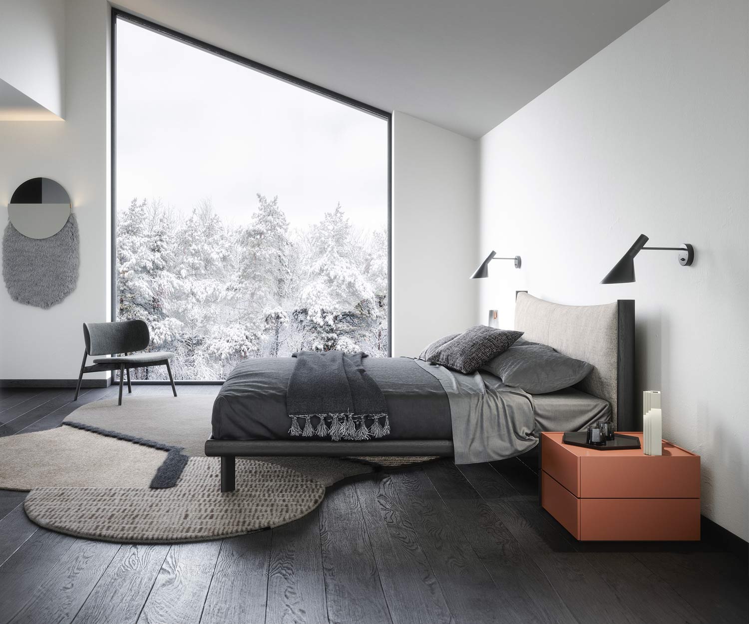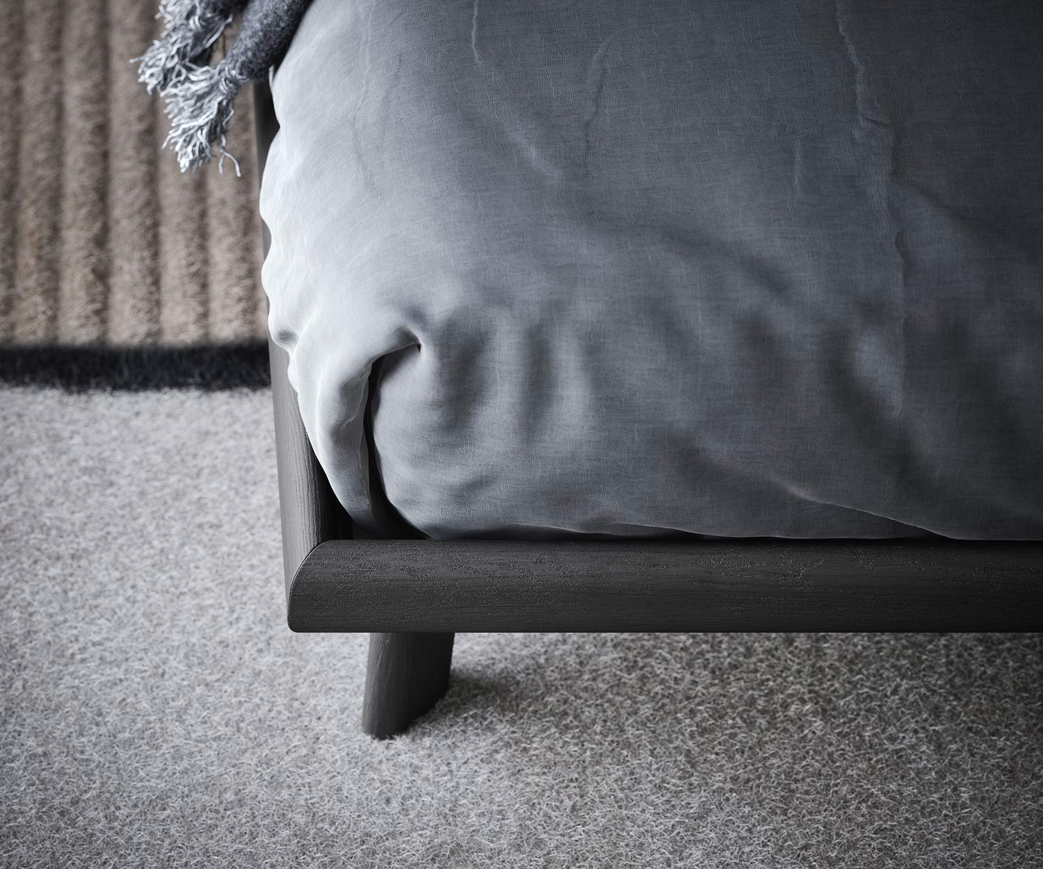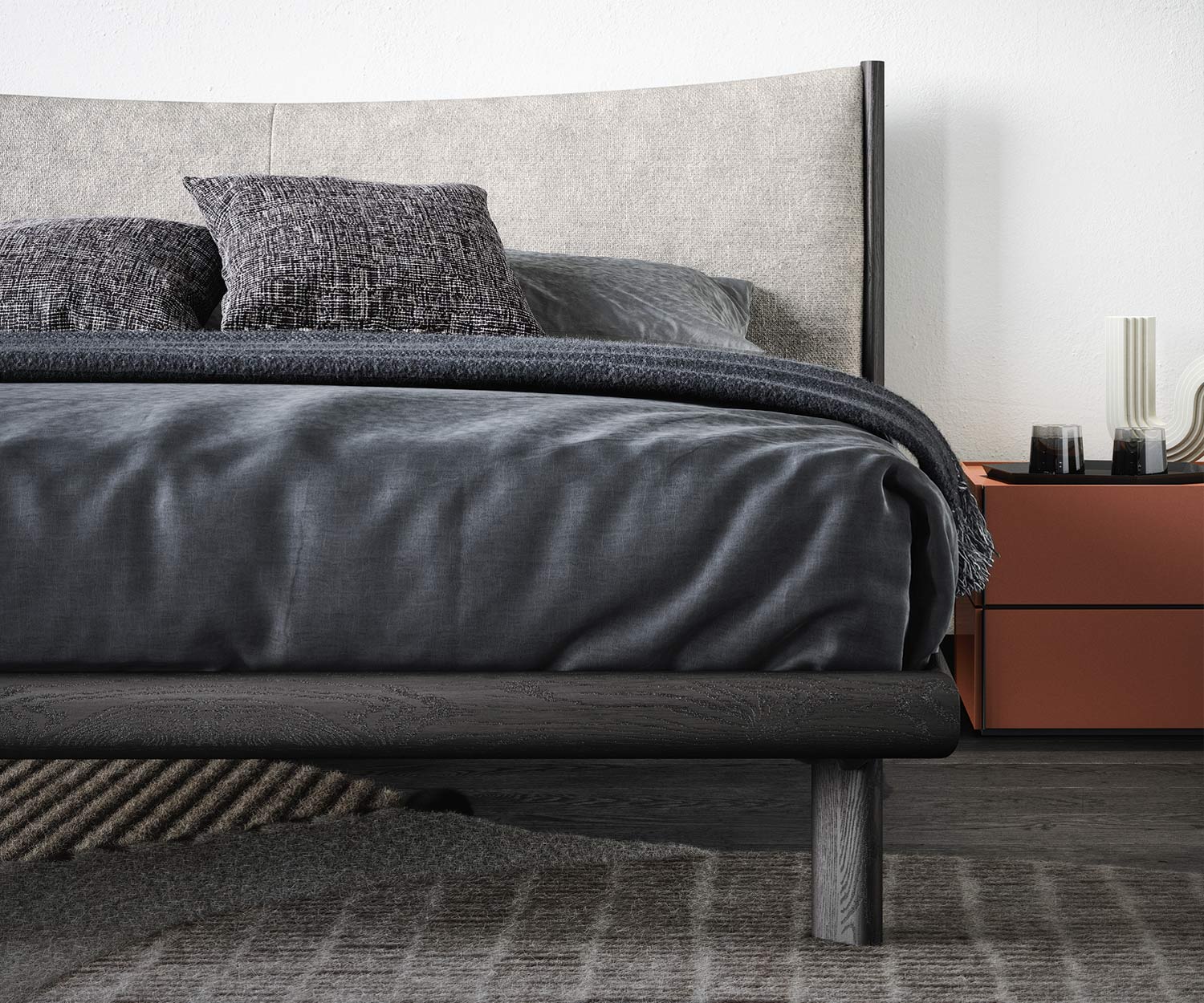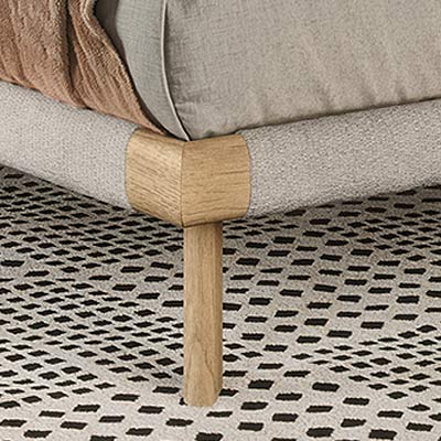 Die Bettumrandung, das Seitenteil vom Kopfteil und die Beine bestehen aus furniertem gebürstetem Massivholz. Erhältlich in den Holzfarben Heller Eiche (Rovere Chiaro), Walnuss (Rovere Terra) und schwarz gebeiztem Eschenholz (Rovere Carbone).