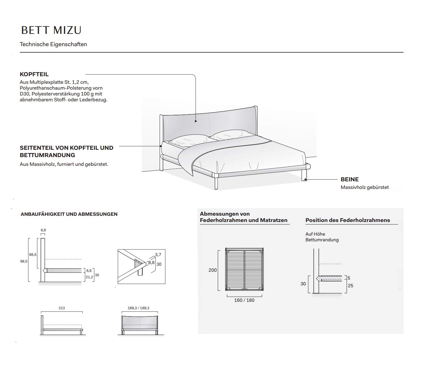 Das Kopfteil des Bettes besteht aus Multiplexplatte als Tragematerial. Es ist mit Polyurethanschaum (D30) sowohl vorne als auch hinten gepolstert und hat eine Polyesterverstärkung von 100g. Mit abziehbarem Stoffbezug.