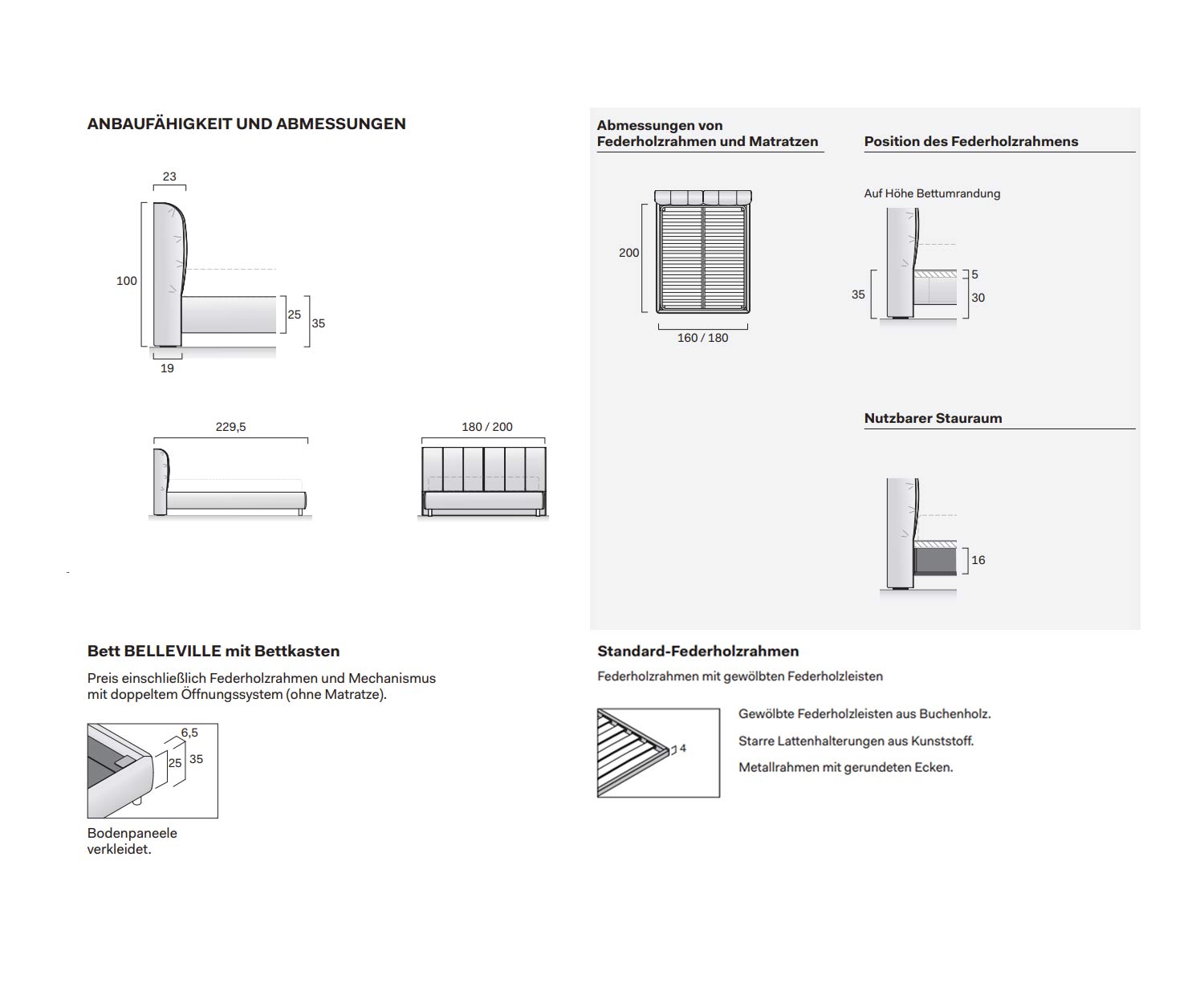 Der Preis des Bettes umfasst den Federholzrahmen und den Mechanismus mit einem doppelten Öffnungssystem, jedoch ohne Matratze. Es wird empfohlen, dass das Gesamtgewicht aus Matratze und Bezügen 45 kg nicht überschreitet, damit der Hubmechanismus einwandfrei funktioniert. Die maximale Traglast, die gleichmäßig auf der Bodenplatte des Bettkastens verteilt werden sollte, beträgt 65 kg.