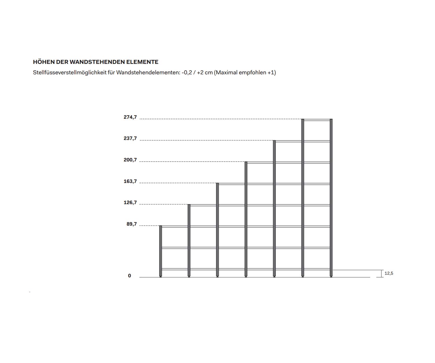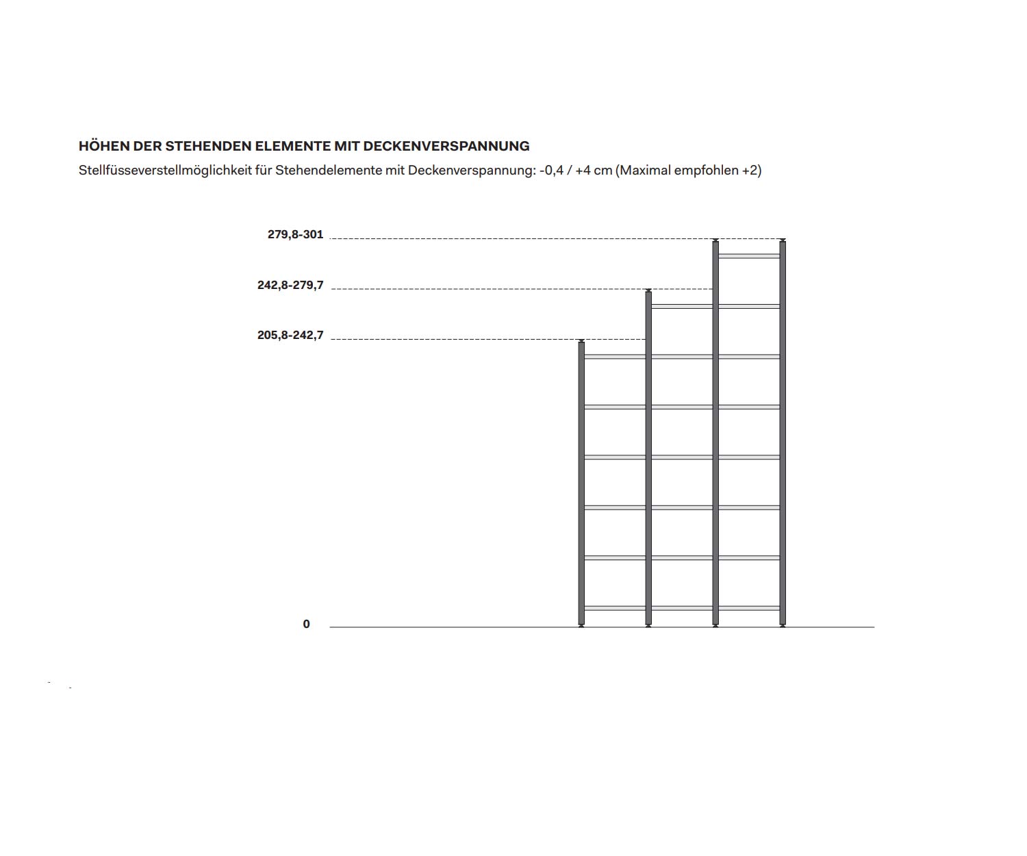 The following heights are possible: 93.7 - 132.7 - 171.7 - 210.7 - 249.7 - 288.7 cm