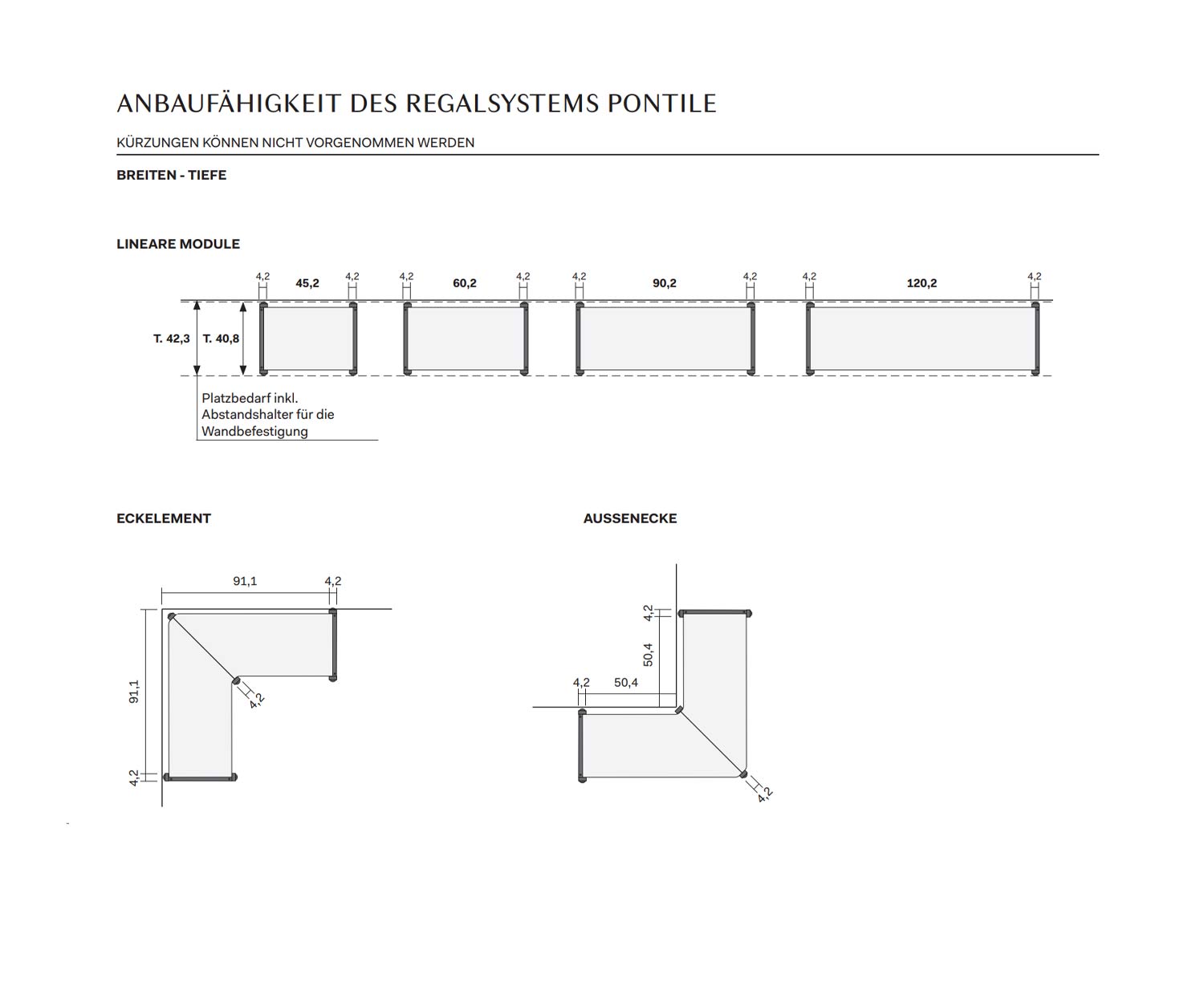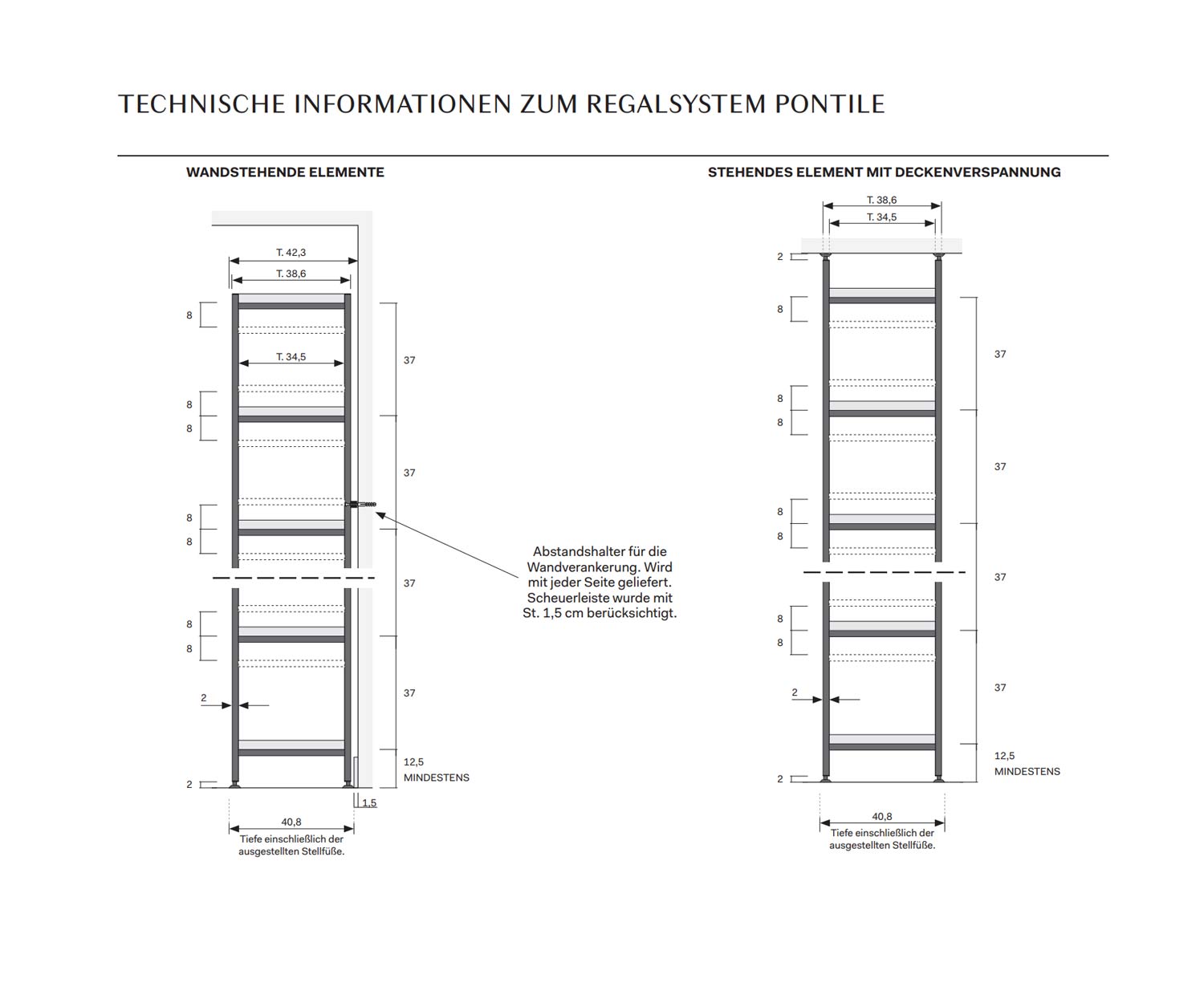 The shelf can be varied in width and height (see sketch for possible dimensions). Closed and open boxes can be integrated on request.