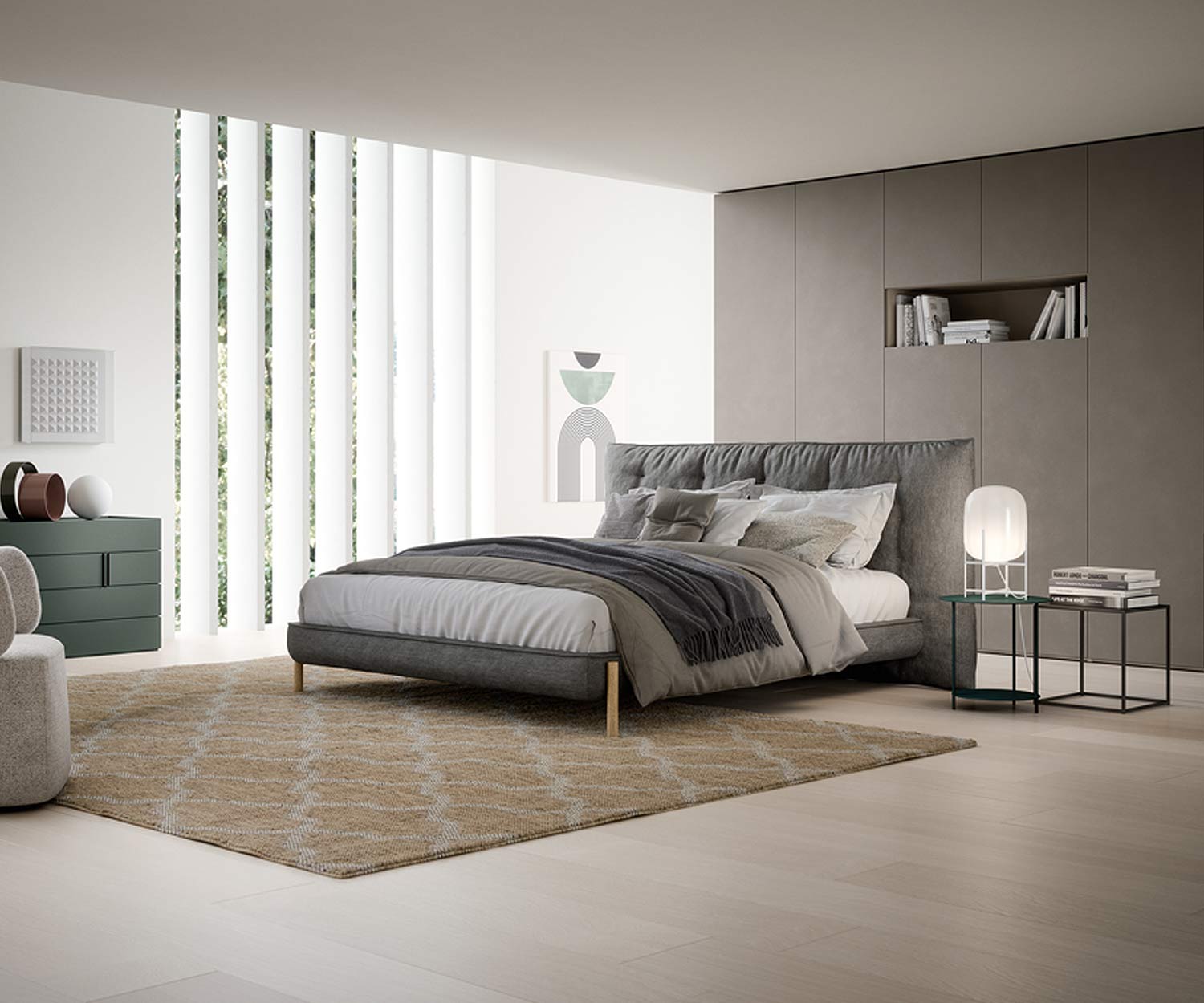 The Novamobili Tufte bed captivates with its eye-catching elegance at the sight of the slender feet and the upholstered headboard with sophisticated vertical side quilting. This bed is produced exclusively for you in Italy.