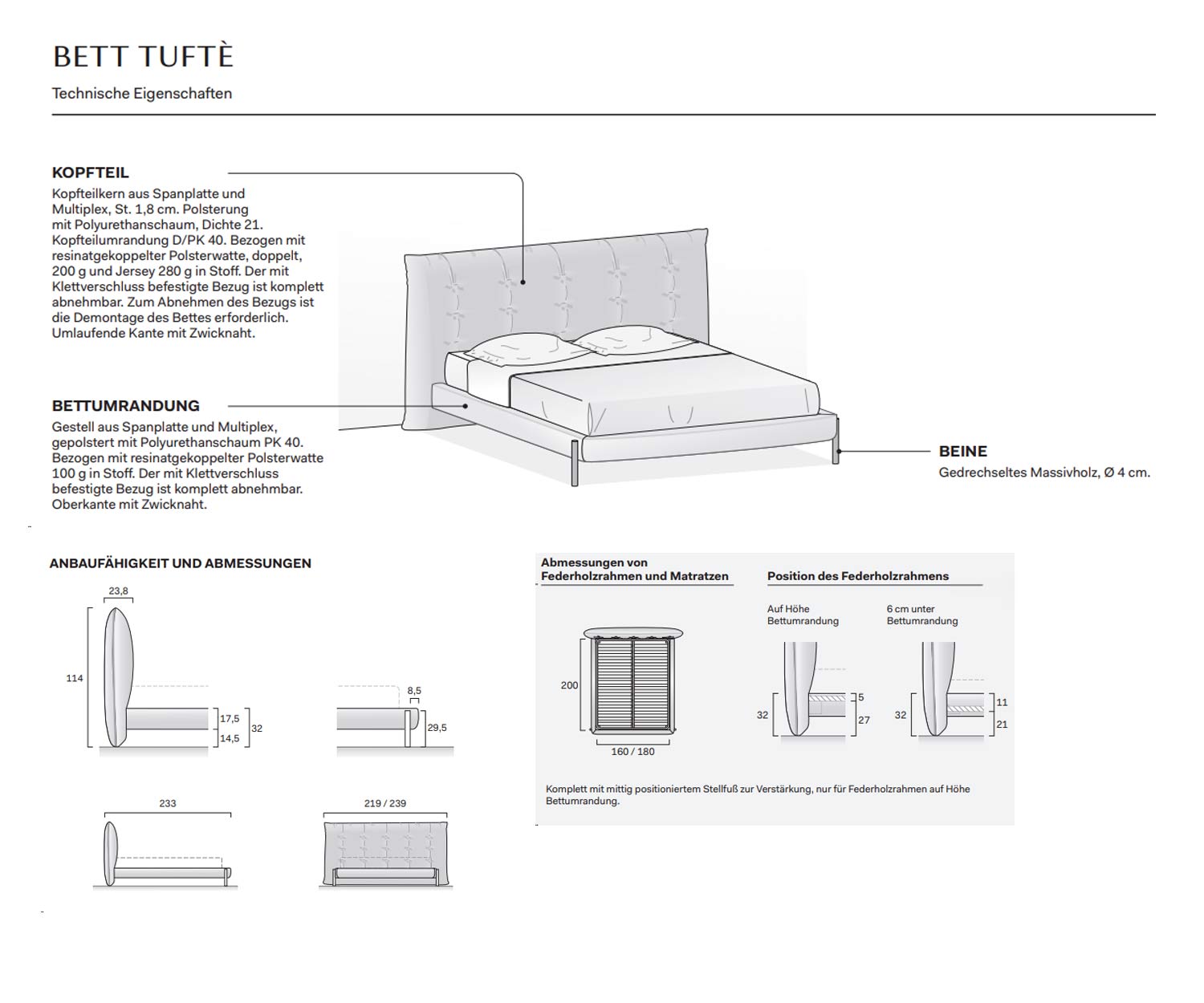 The headboard and bed surround of the Novamobili Tufte bed are made of multiplex (five layers of veneer glued together) and chipboard and contain polyurethane foam padding. The headboard surround is upholstered with resinate-linked wadding.