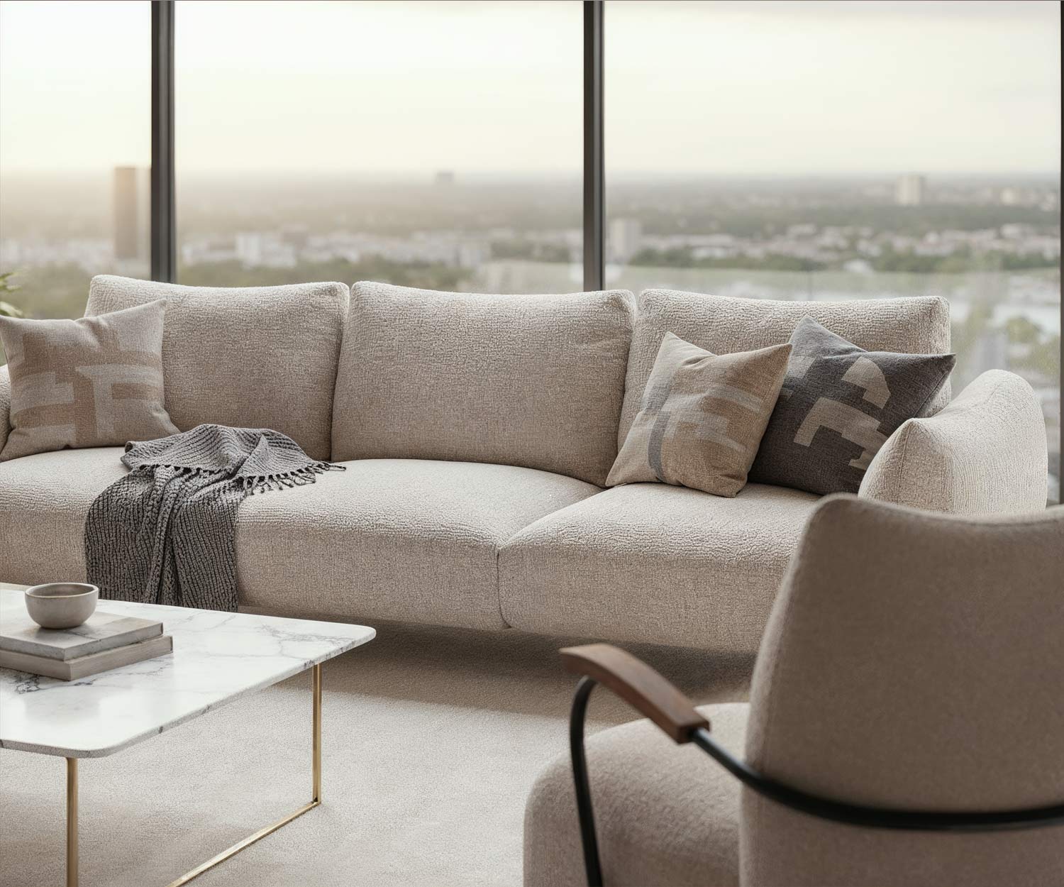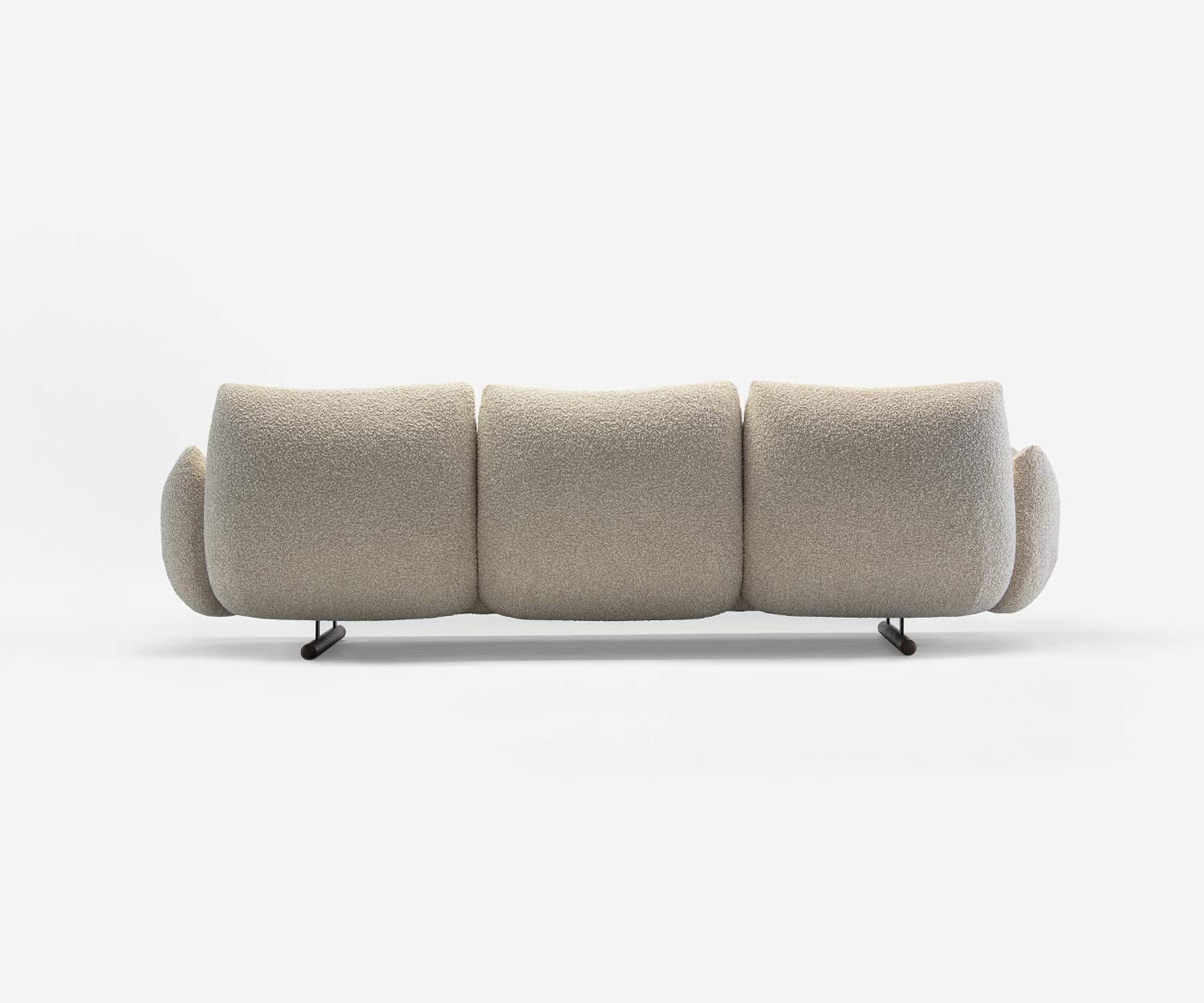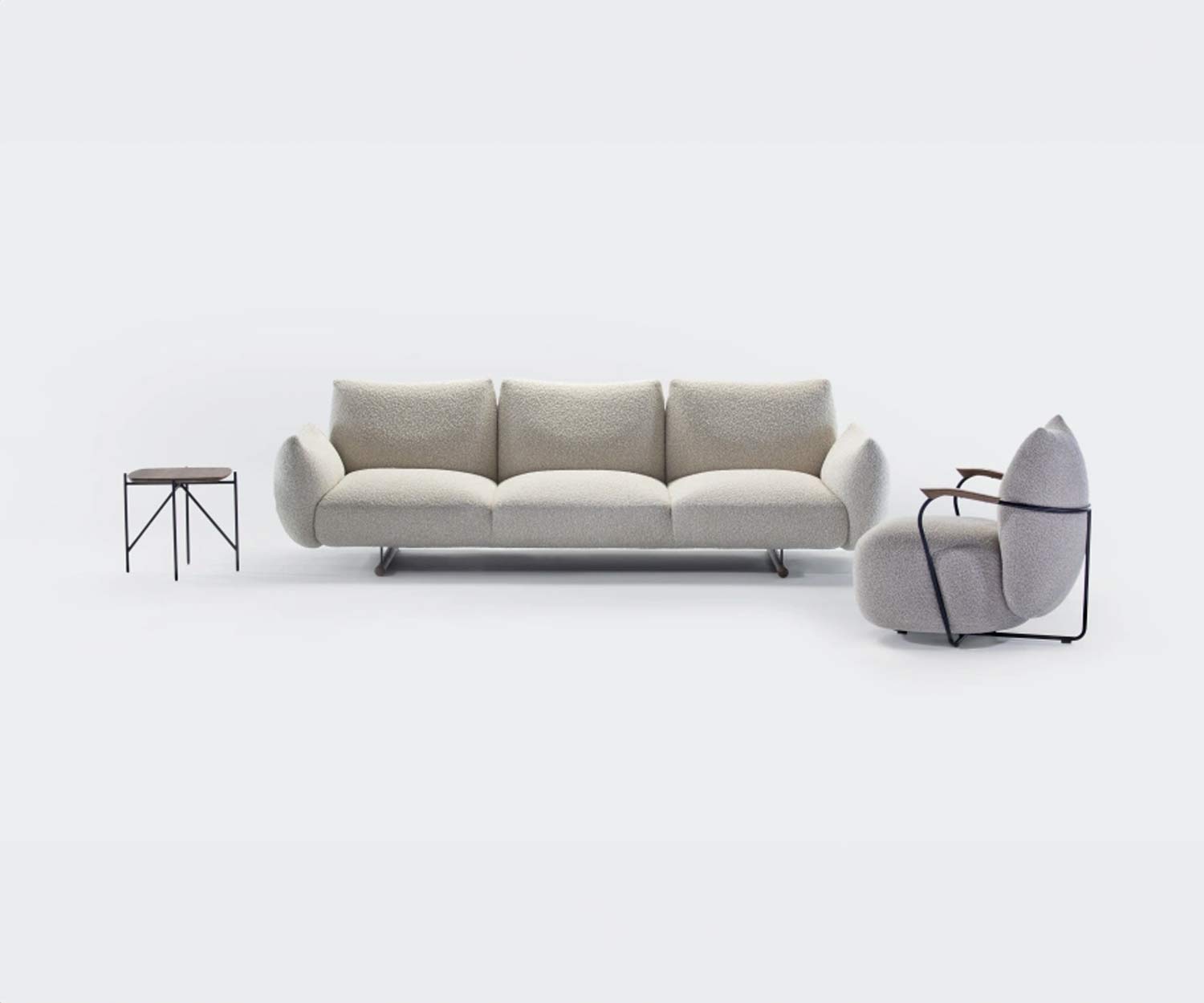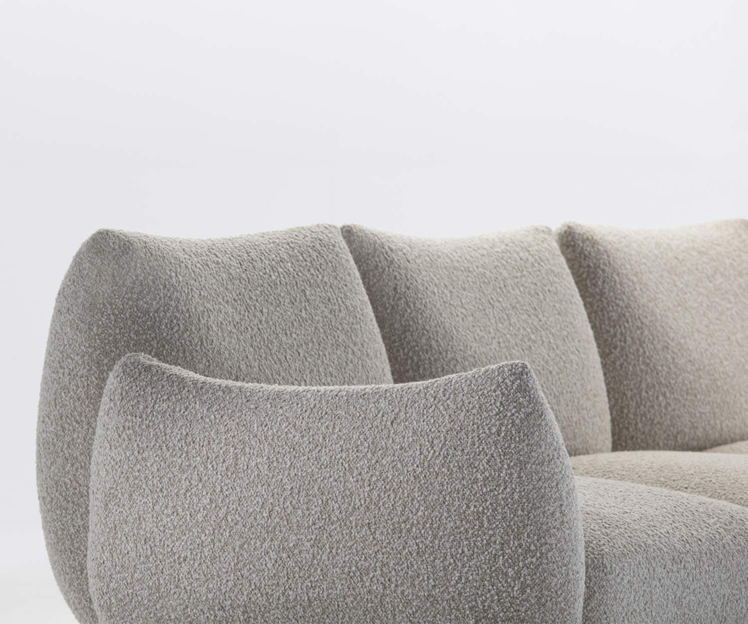The Buffa armchair and bouclé sofa go beyond conventional upholstered furniture, offering not only a functional but also an artistic presence in the room. The soft, rounded lines and the playful, fluffy shape are reminiscent of the cheerful lightness of Italian comic opera and add a touch of humour to the luxurious look of the sofa.