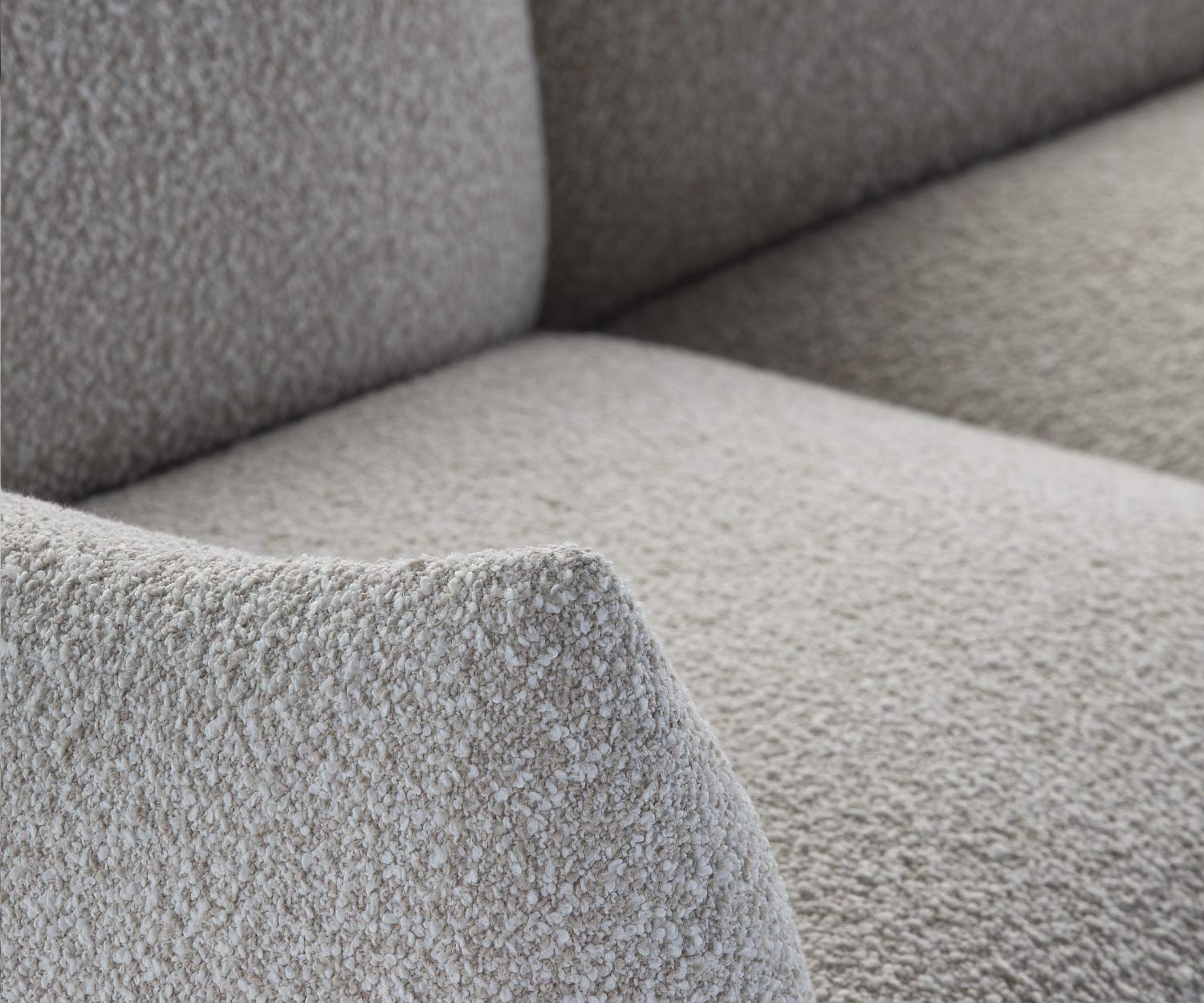 The upholstery fabric of the Prostoria Buffa design sofa is available in 3 colours: bouclé beige, light greyor dark grey. The Buffa sofa is available in two versions: as a 2-seater and as a 3-seater, each with the option of an armrest for added comfort.