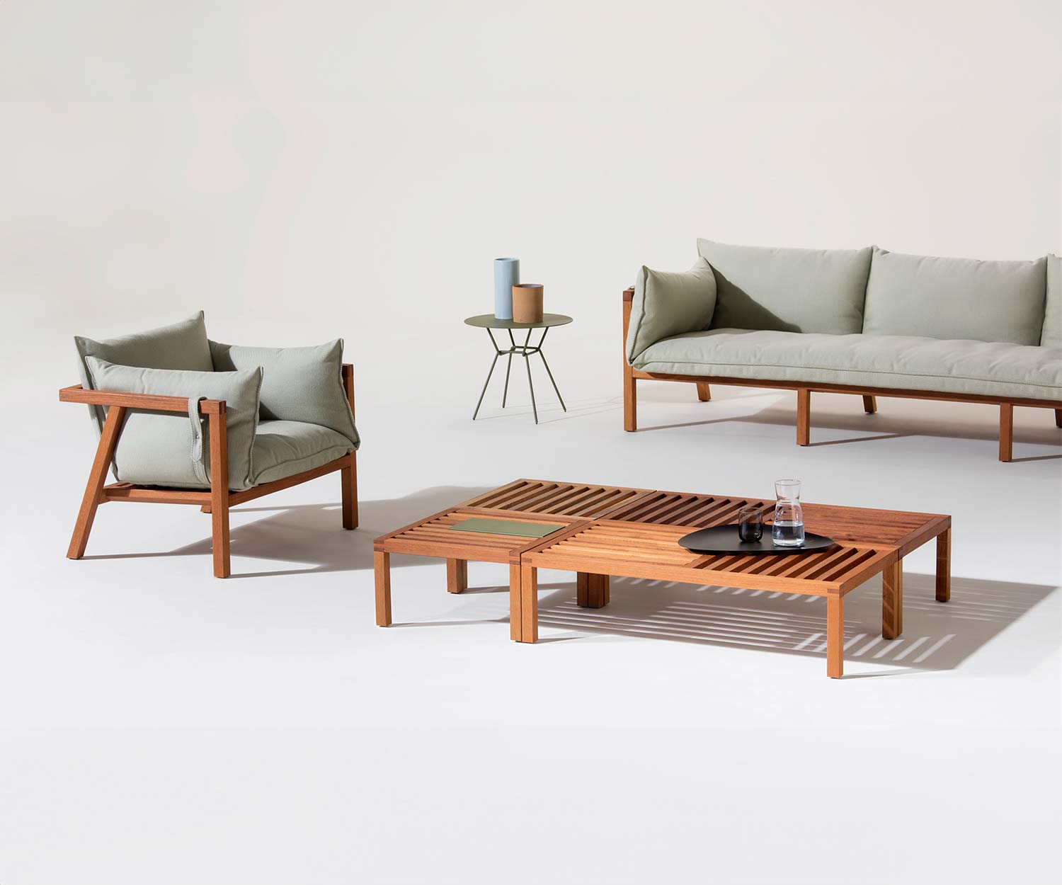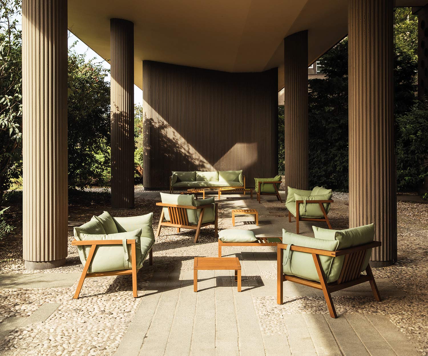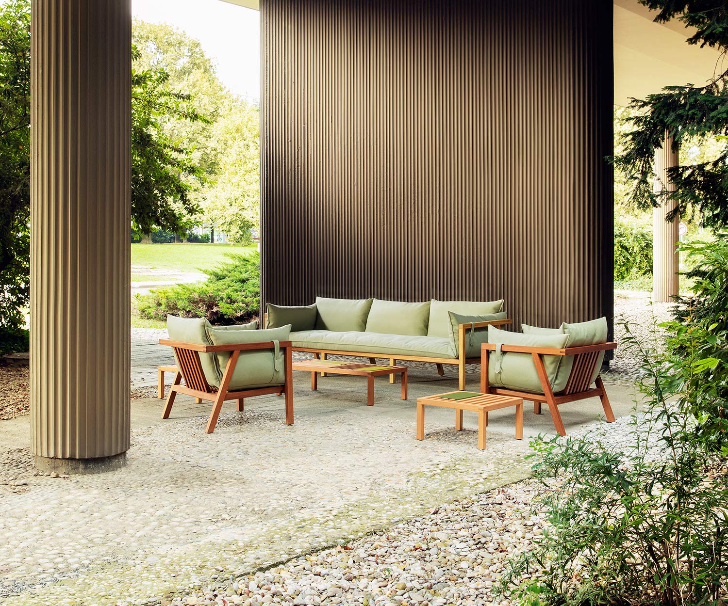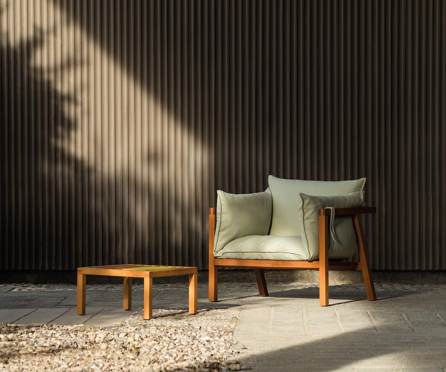 The Umomoku outdoor armchairs, sofas and sun loungers are available in natural teak and are waterproof. The seat cushions and backrest cushions are available in light green (indoor fabric) and light grey or ecru white (waterproof outdoor fabric).