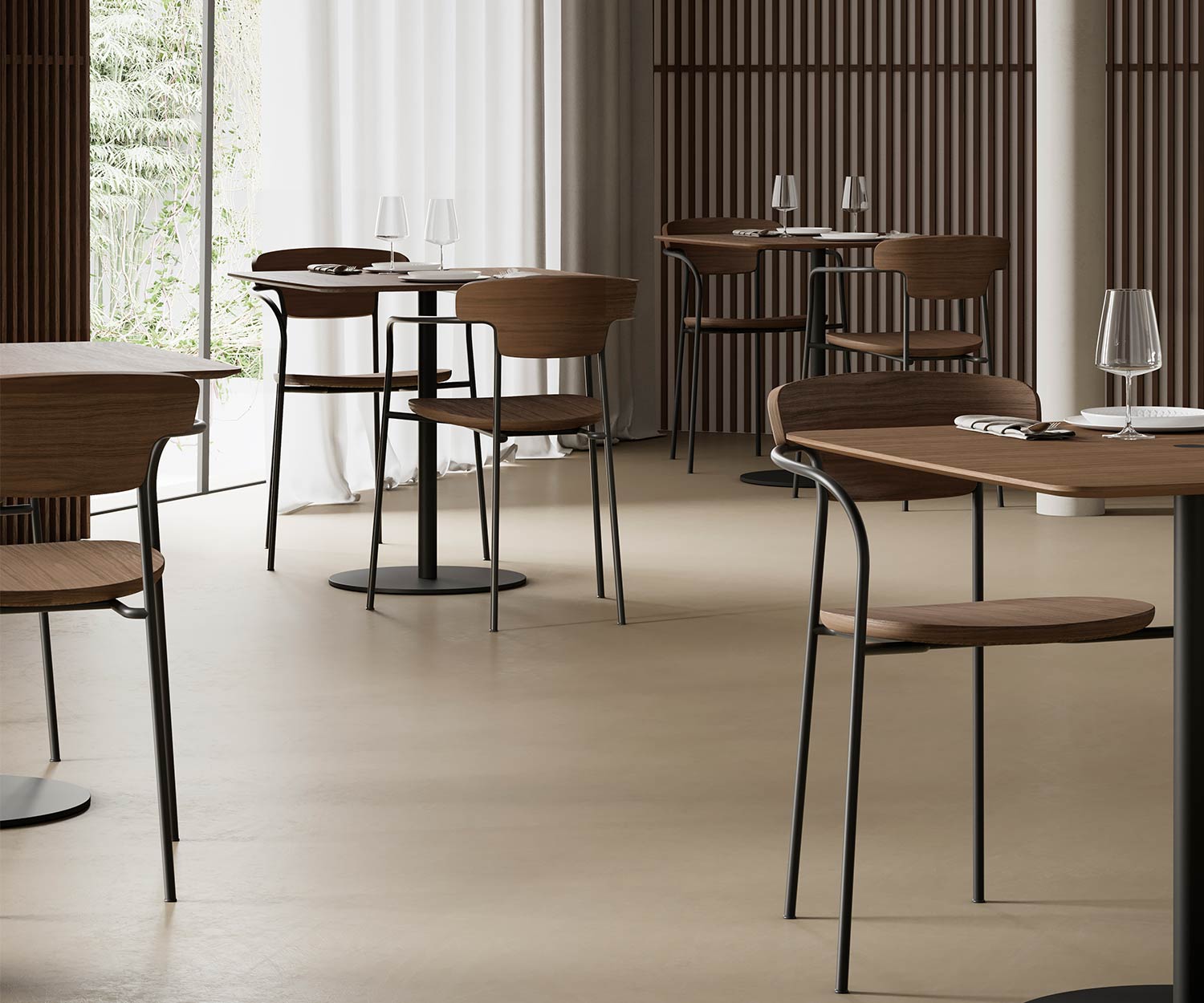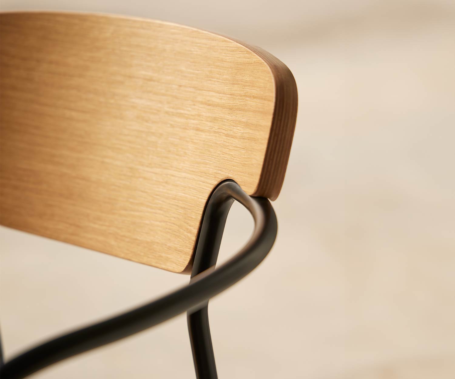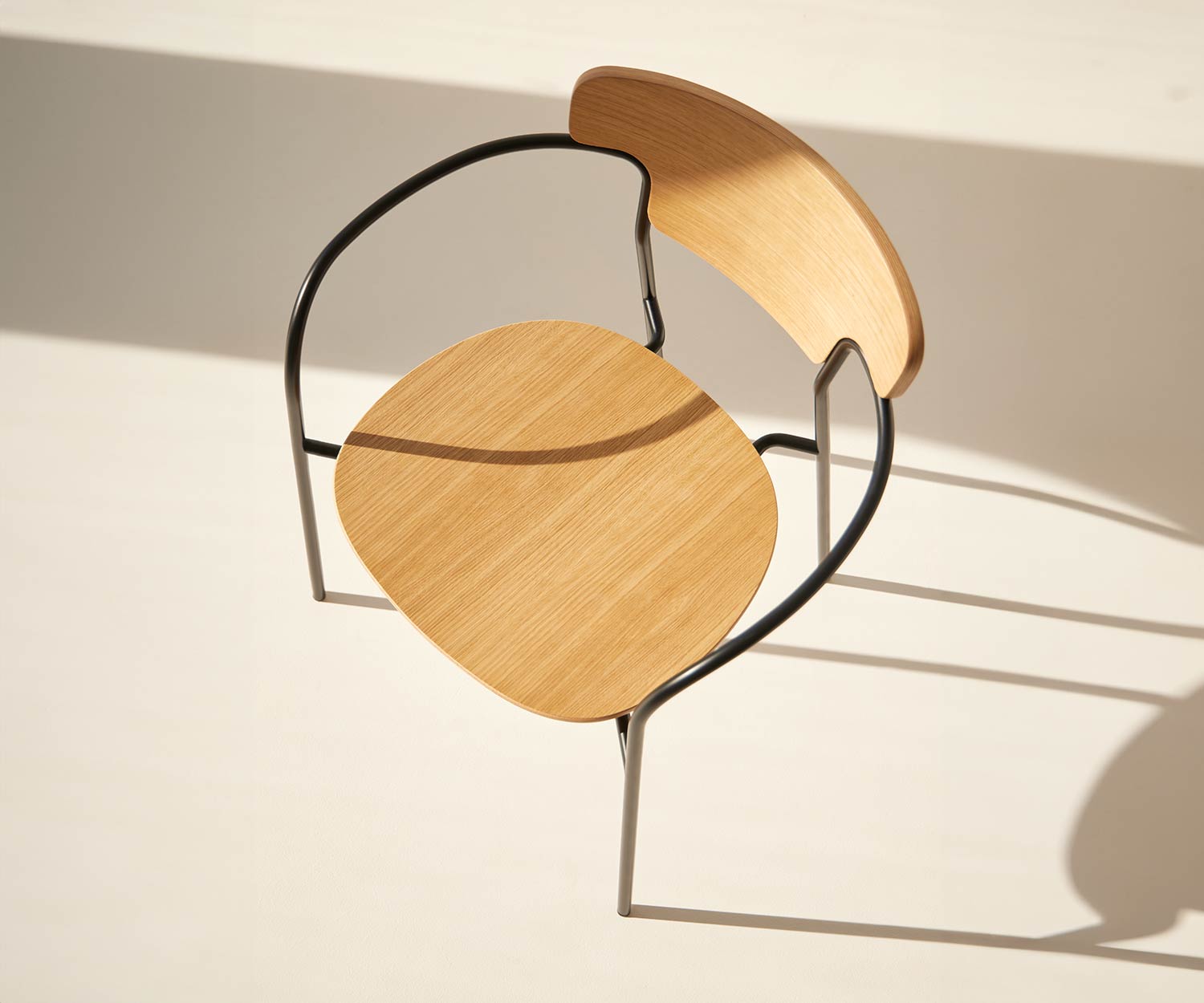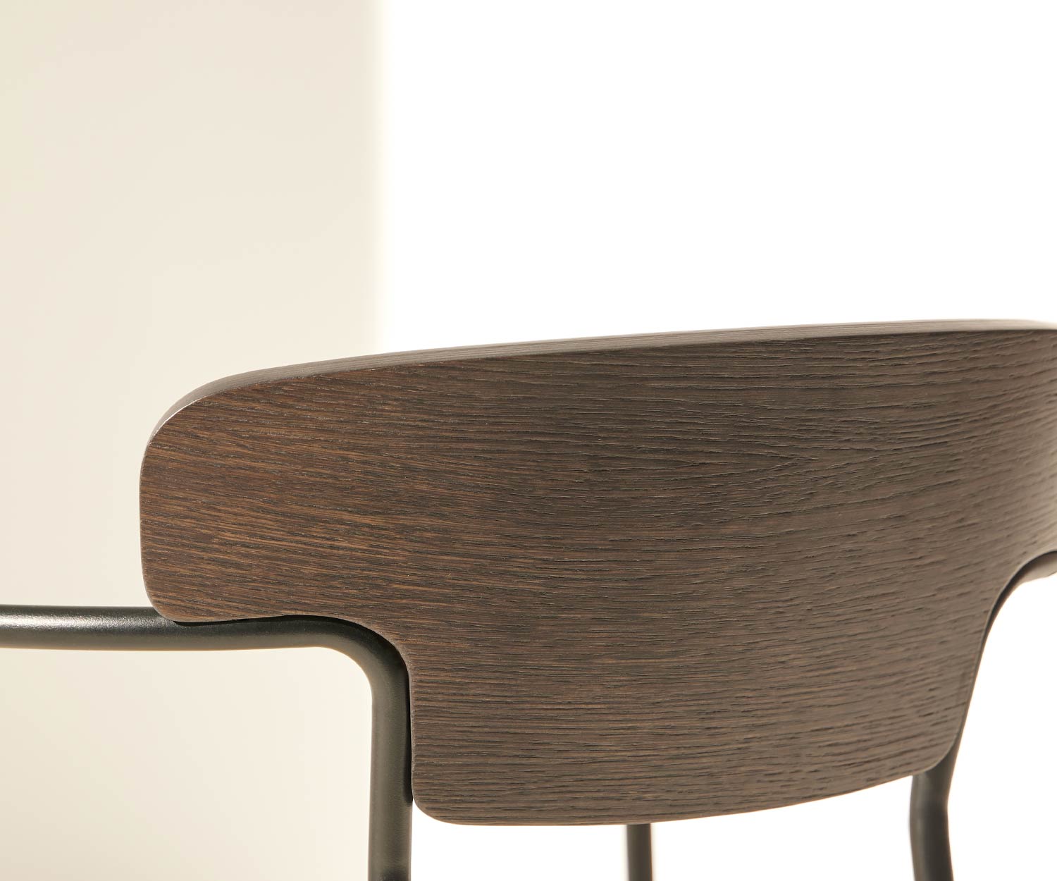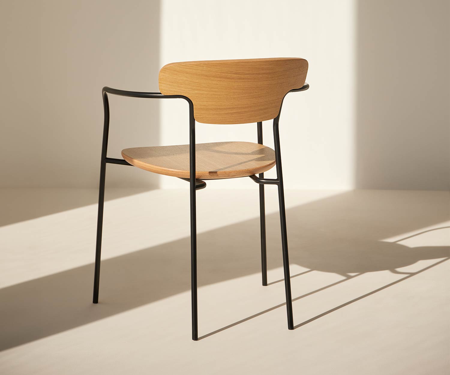 The Punt Pecan wooden chair is available in solid super matt oak and stained walnut oak. The frame and armrests are made of steel and painted in epoxy black.