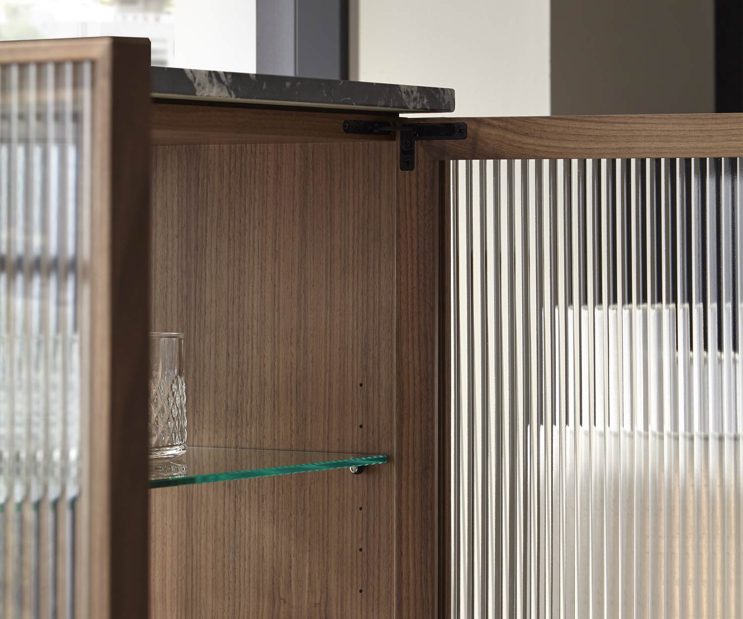 With its special design, the Punt Rio sideboard creates a creates a contrast for the observer. On the one hand, there are the two solid columns that symbolise stability and grandeur. On the other hand, the cabinets above them symbolise precision and refinement. The slender wooden frames around the glass doors form something like a bridge between the two heavy columns. columns.