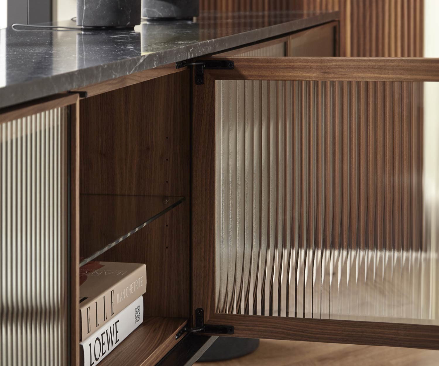 The centrepiece of the Punt Rio designer sideboard is the high-quality high-quality MDF boards, which are finished with walnut veneer. Cover plate and base columns are made of matt Marquina marble, while the plinth is made of metal with an epoxy paint finish. The doors are made of tempered glass.