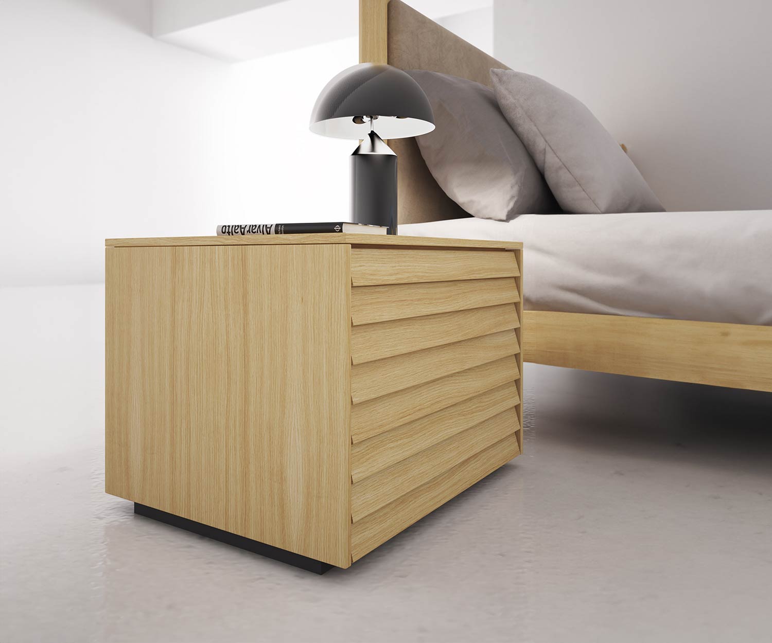 Designed by Terence Woodgate, the Punt Sussex Design bedside cabinet is a small but elegant companion for a bedroom with an exclusive living style, thanks in particular to the unique slatted front of the bedside cabinet and the solid natural wood in oak and walnut. The unusual design is reminiscent of shutters in summery Spain.