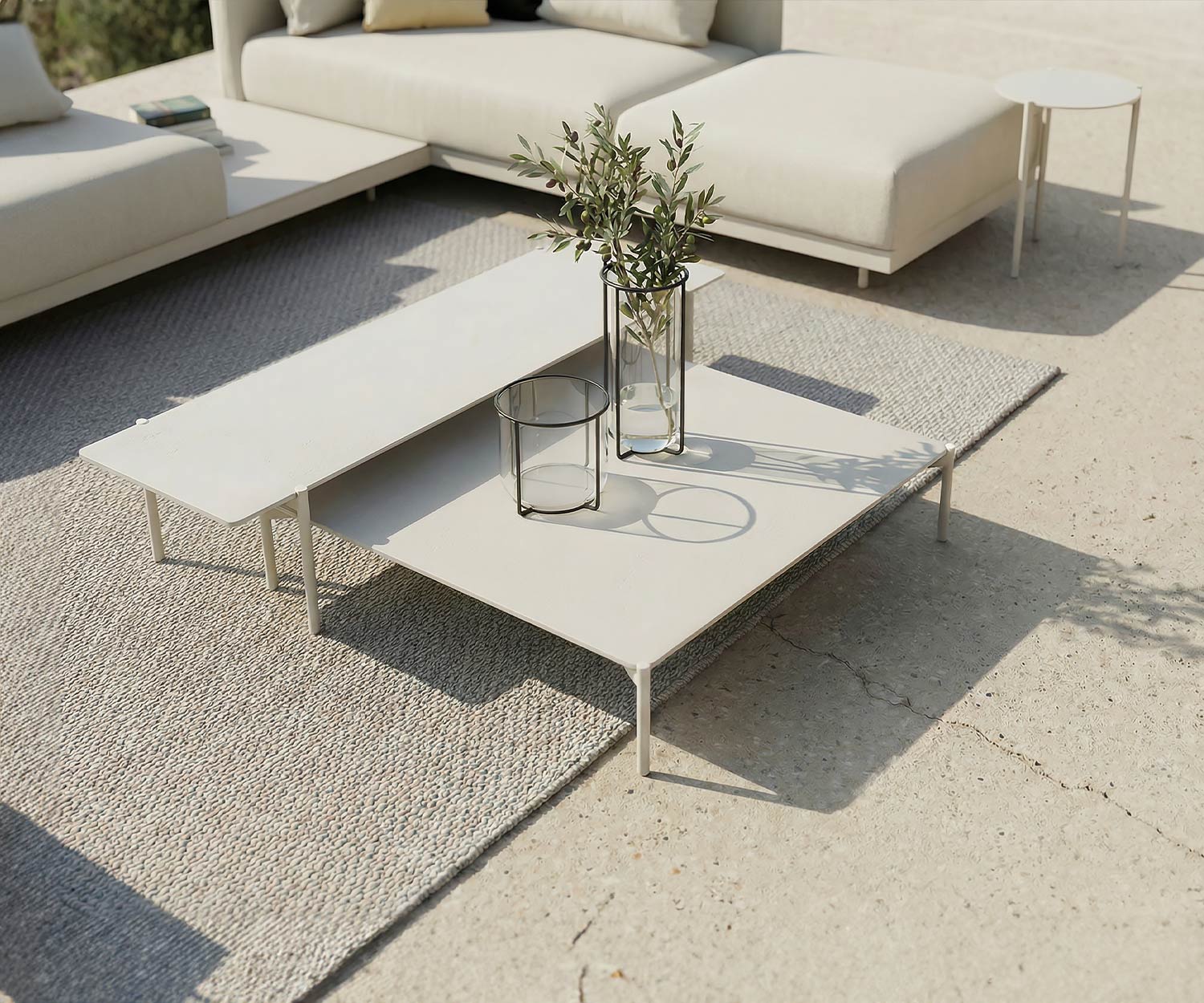 Raffiniertes Design für Ihre Lounge: Die Outdoor-Couchtische lassen sich als stilvolles Ensemble kombinieren, bei dem die niedrigeren Modelle elegant und platzsparend unter den höheren Tisch geschoben werden können.