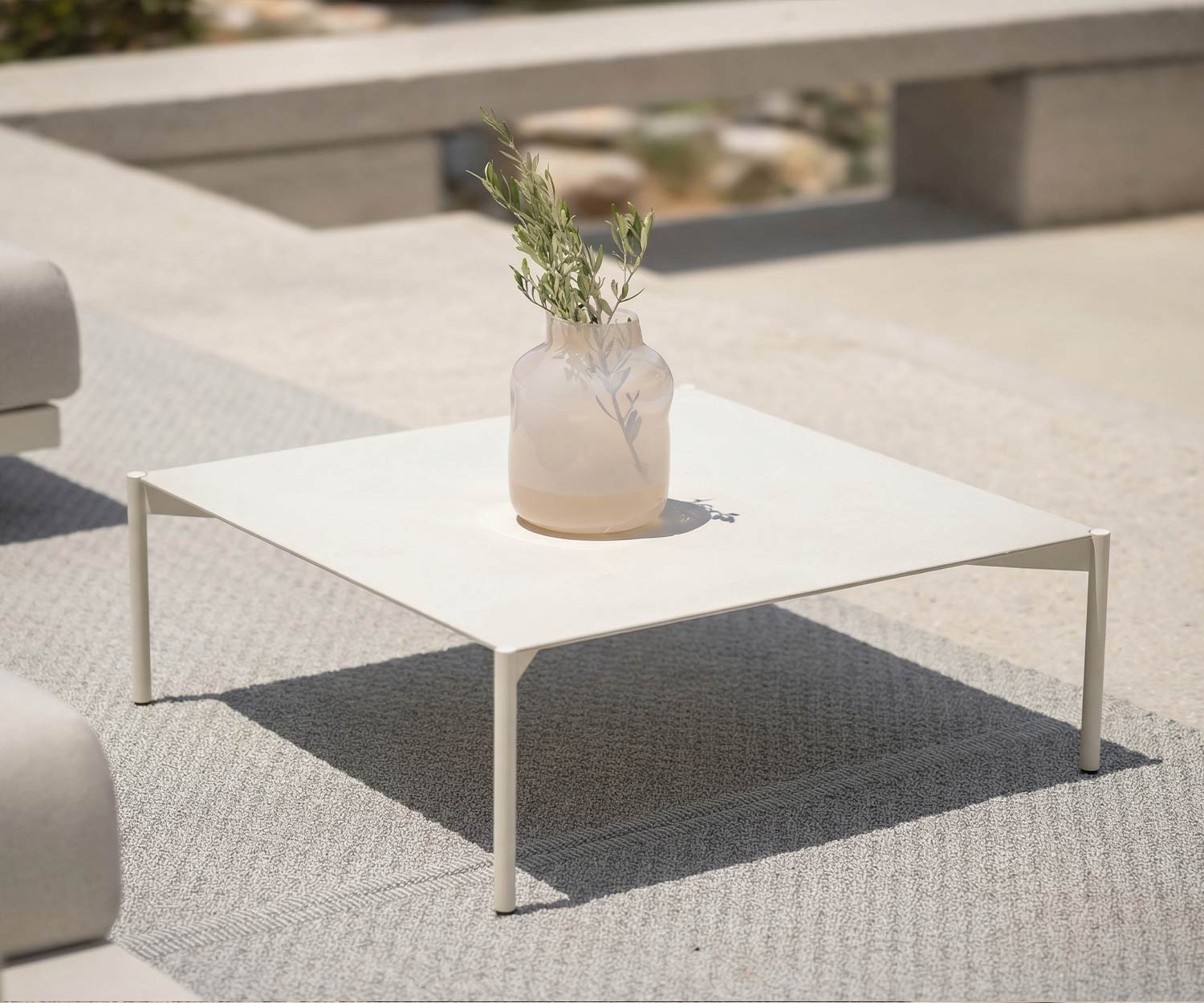 Das robuste Gestell des Dongo Outdoor Couchtisches besteht aus matt lackiertem, pulverbeschichtetem Edelstahl und ist in den eleganten Farben Creme Weiß (115) oder Anthrazit (145) erhältlich.