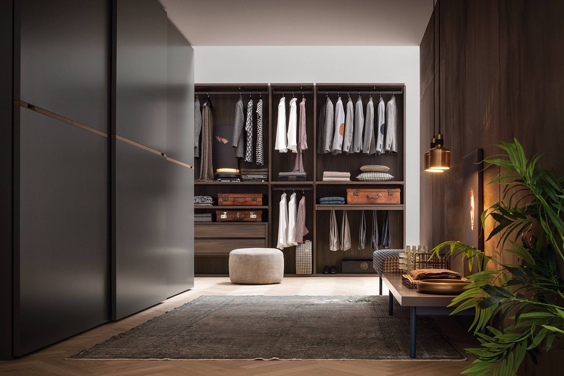 Moderner Kleiderschrank mit Schiebetüren in schwarz matt und Holzierleisten. Im Hintergrund ist ein offenes Kleiderschranksystem zu sehen. Beide Kleiderschränke können individuell an die Bedürfnisse angepasst werden.
