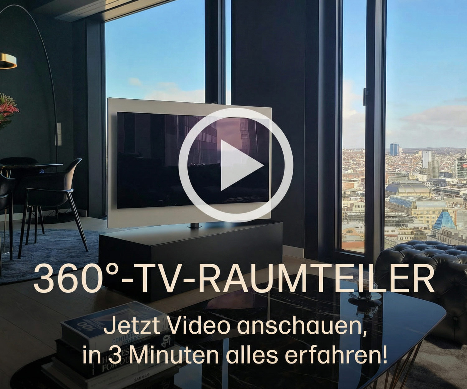 Das Besondere an diesem Design-Möbel: Es ist komplett freistehend drehbar. Die TV-Säule lässt sich um 360° schwenken, sodass Sie aus jeder Perspektive fernsehen können – egal ob vom Sofa oder vom Esstisch aus.