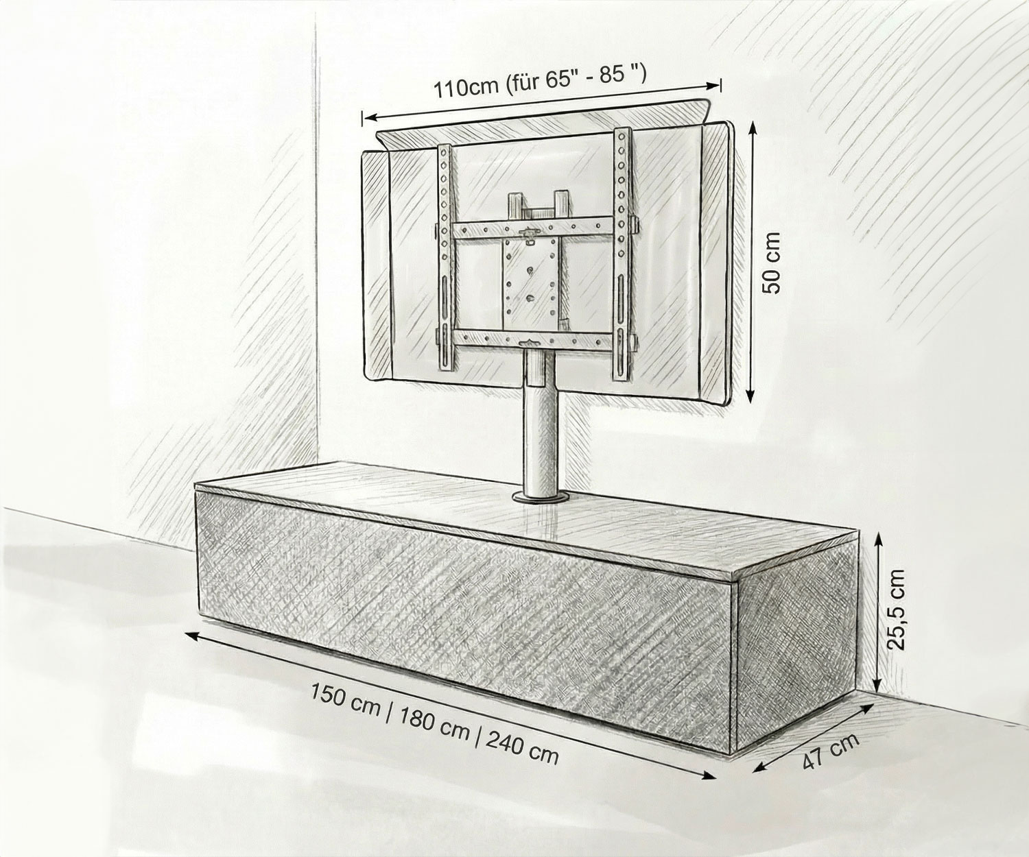 Das absolute Highlight des Roto Slim ist seine integrierte TV-Säule, die Funktionalität neu definiert. Die Konstruktion wurde gezielt verstärkt und trägt nun problemlos Großbildschirme jenseits der 65 Zoll.