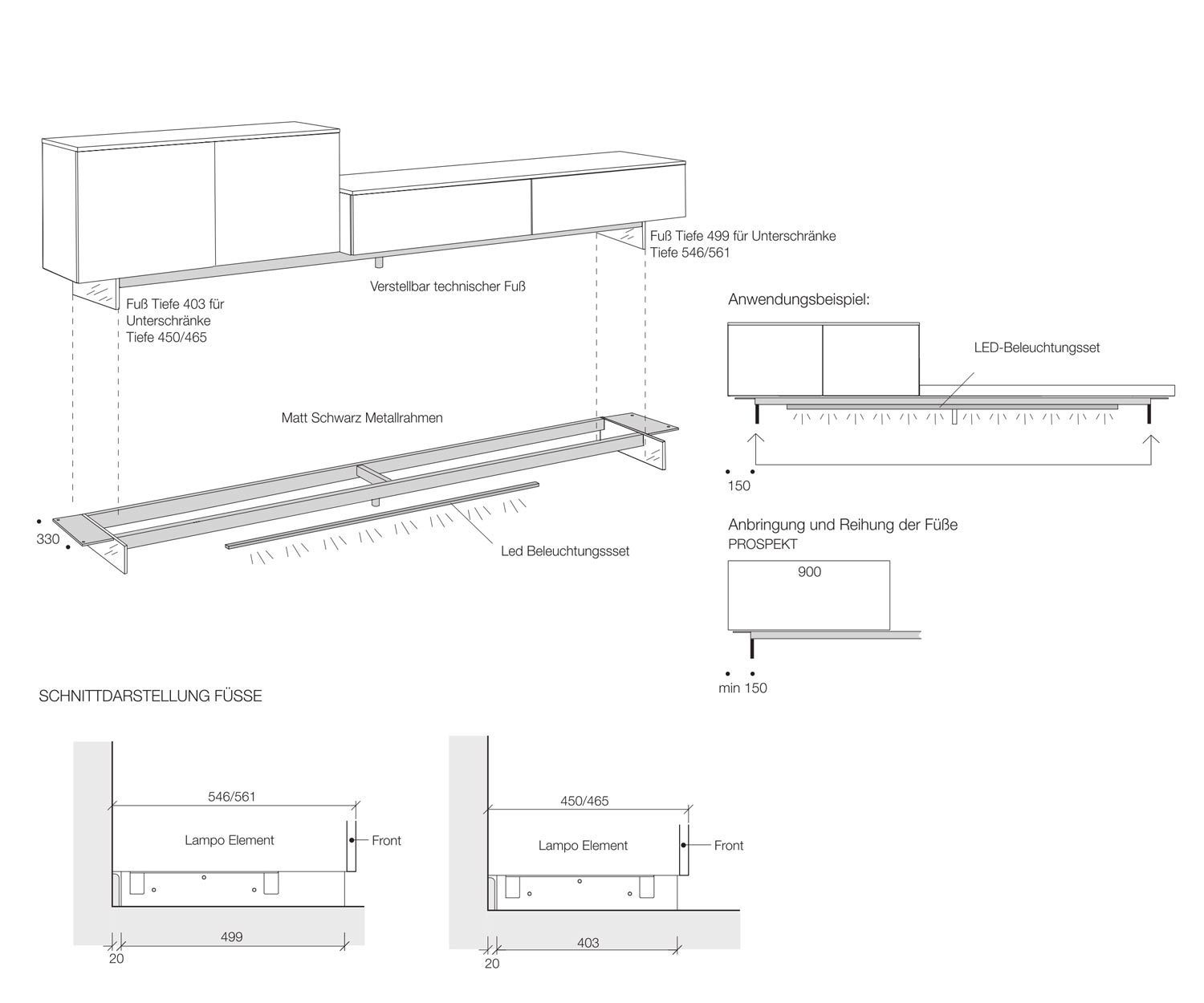 Der Sockel verfügt über einen schwarzen Metallrahmen, der mit dem Unterboden des Lowboards verschraubt wird. Der Sockel hat mit einer Tiefe von 39,7 cm eine geringere Tiefe als das Lowboard und ist daher kaum sichtbar. In der Mitte befindet sich ein dritter Standfuß, der in der Höhe verstellbar ist. Dieser verhindert ein Durchbiegen bei großer Belastung. Optional kann eine LED Beleuchtung (3000K) unter dem Sockel dazu bestellt werden.