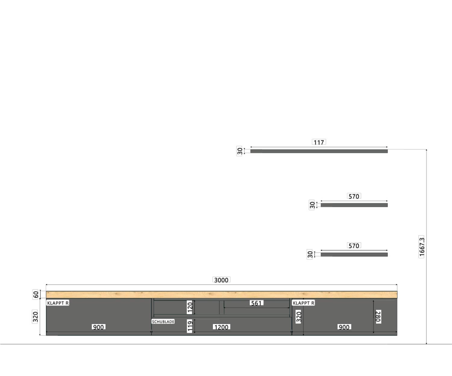 - 1 x Wandregal lang: B 117 cm / H 3 cm / T 33 cm