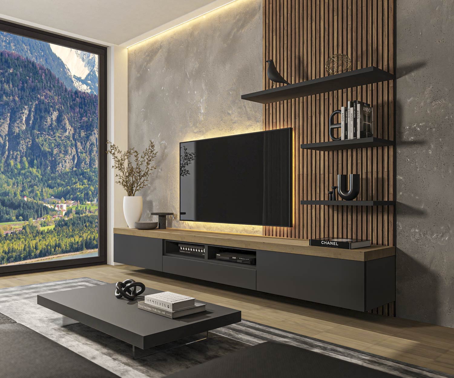 Diese moderne Livitalia TV-Wohnwand C101 beeindruckt durch ein schwebendes Lowboard, das mit seiner 6 cm starken Abdeckplatte eine besonders massive und hochwertige Optik bietet. Trotz einer Breite von 300 cm wirkt das Lowboard dank der wandhängenden Konstruktion leicht und elegant. Zusätzliche Ablageflächen bieten die drei Wandregale, die farblich perfekt auf das Lowboard abgestimmt sind.