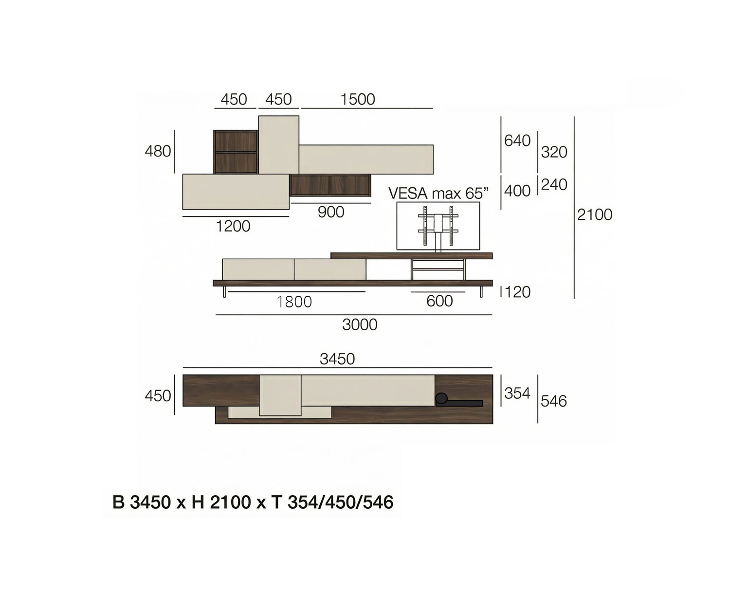 B 345 cm / H 210 cm / T 35,4/45/54,6 cm