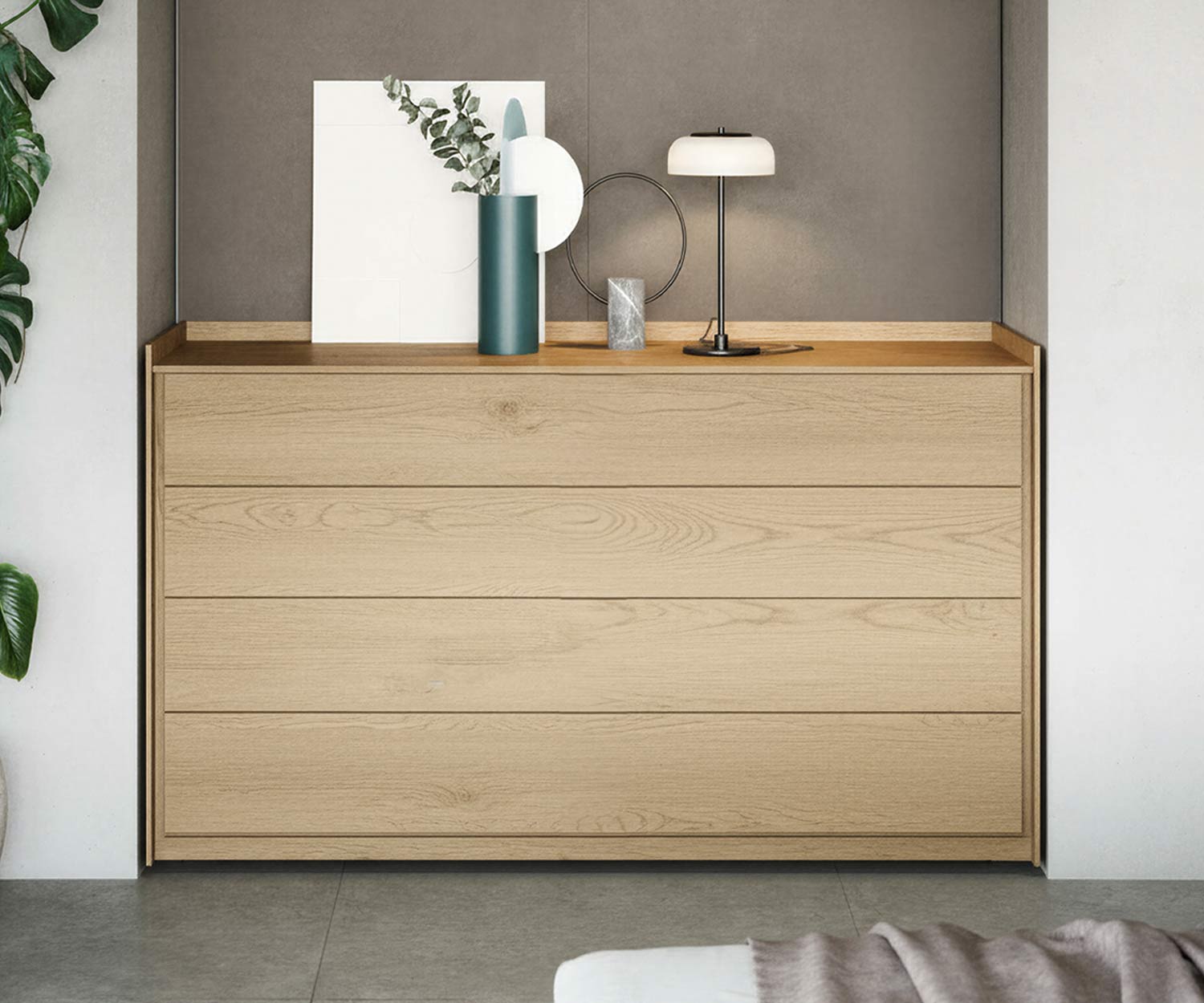 Die Novamobili Kommode Sly ist oben in den Abbildungen in der Farbe Eiche Rovere Chiaro N04 Holzfurnier zu sehen.
