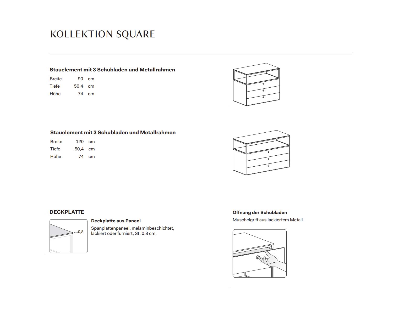Die Abdeckplatte, Rückwand und Unterbodenplatte des offenen Stauelements sowie der Metallrahmen des Stauelements und die Griffe der Schubladen ist erhältlich in derselben Mattfarbe wie der Korpus.