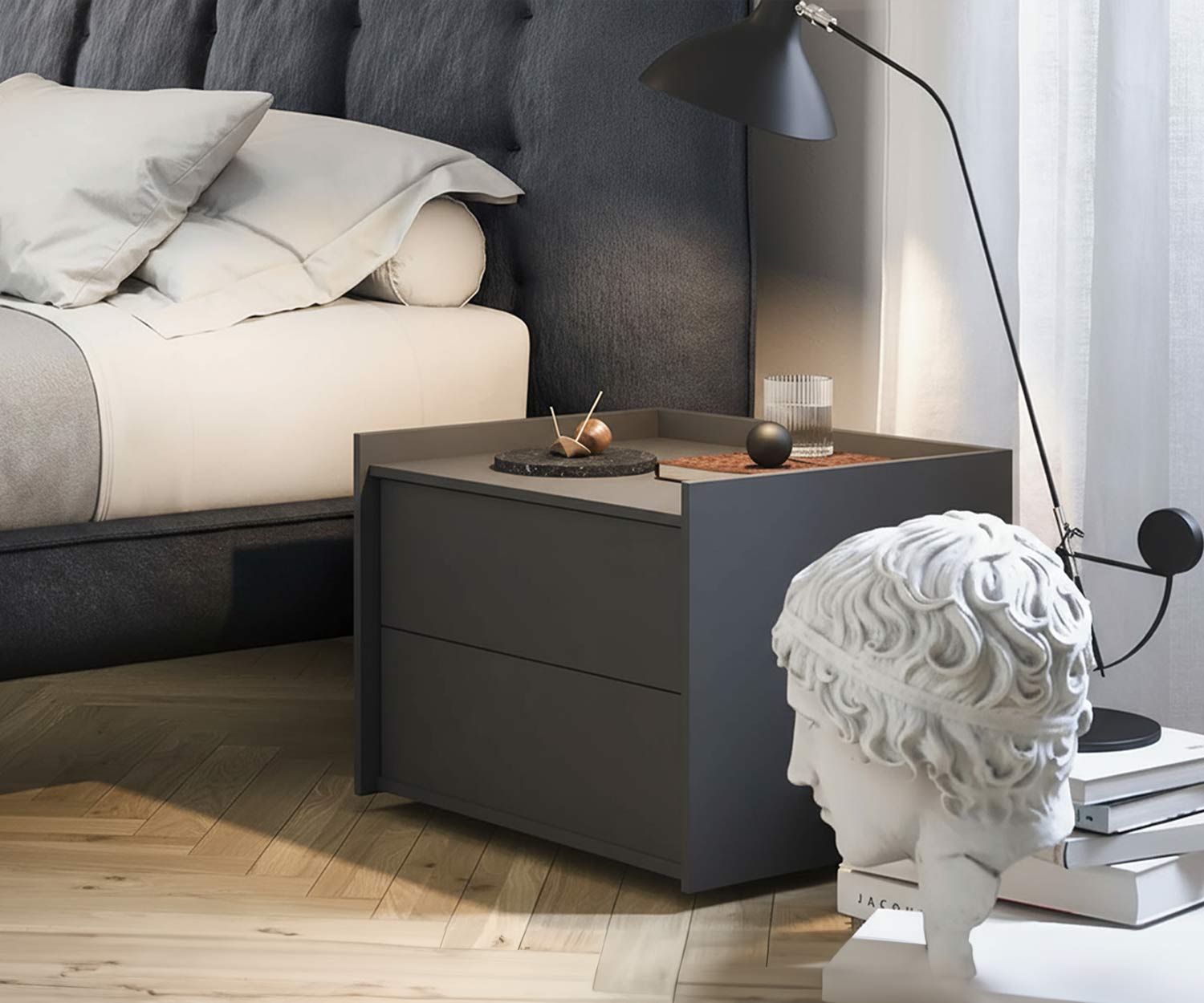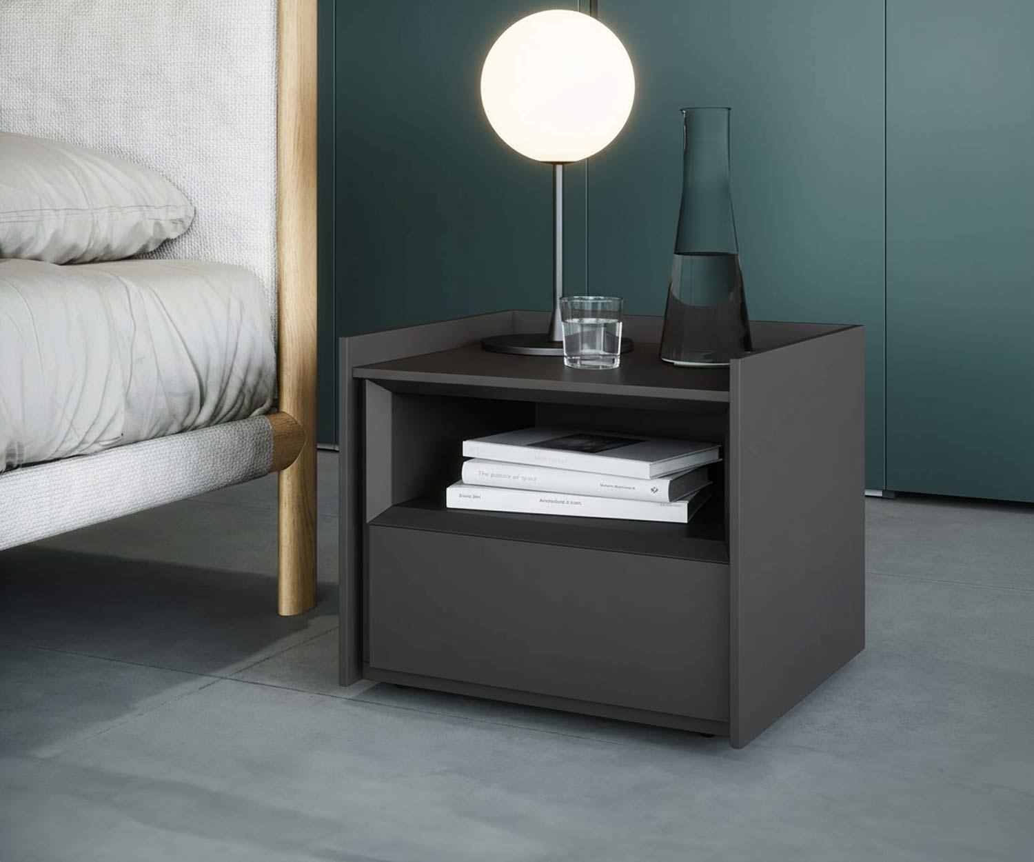 Der Nachttisch ist erhältlich in 5 modernen Matt Farben und 2 Holzfurnieren. Matt Schwarz (ähnlich RAL9017), Weiß (ähnlich RAL9016), Hellgrau (ähnlich RAL7035), Dunkelgrau (ähnlich RAL7022) oder Beige (ähnlich RAL1019). Sowie in Eiche Rovere Chiaro N04 oder Walnuss Noce Canaletto N04.