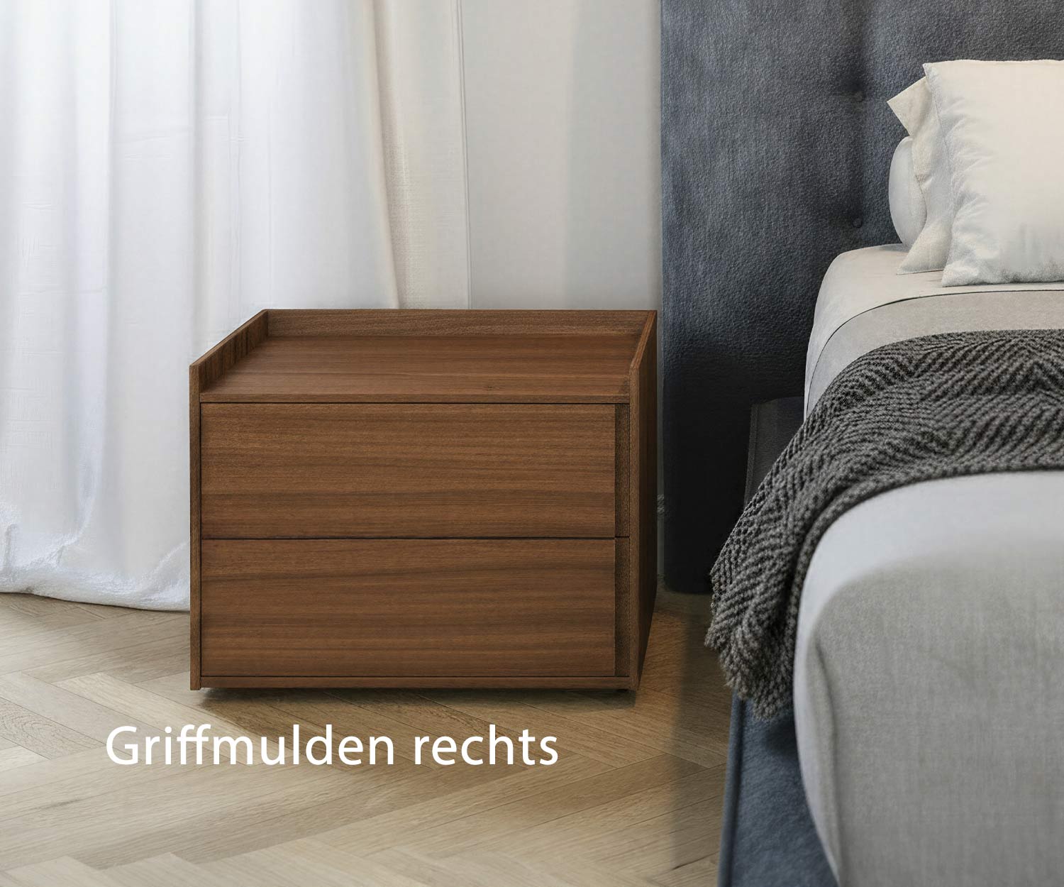 Die Schubladen des Sly Nachttischs verfügen über hochwertige Gleitschienen mit automatischem Einzug (Soft-Close-Technik). Geöffnet werden die Schubladen über eingelassene Griffmulden. Die Seitenausführung der Griffmulden für die passende Bettseite können Sie im Konfigurator auswählen.