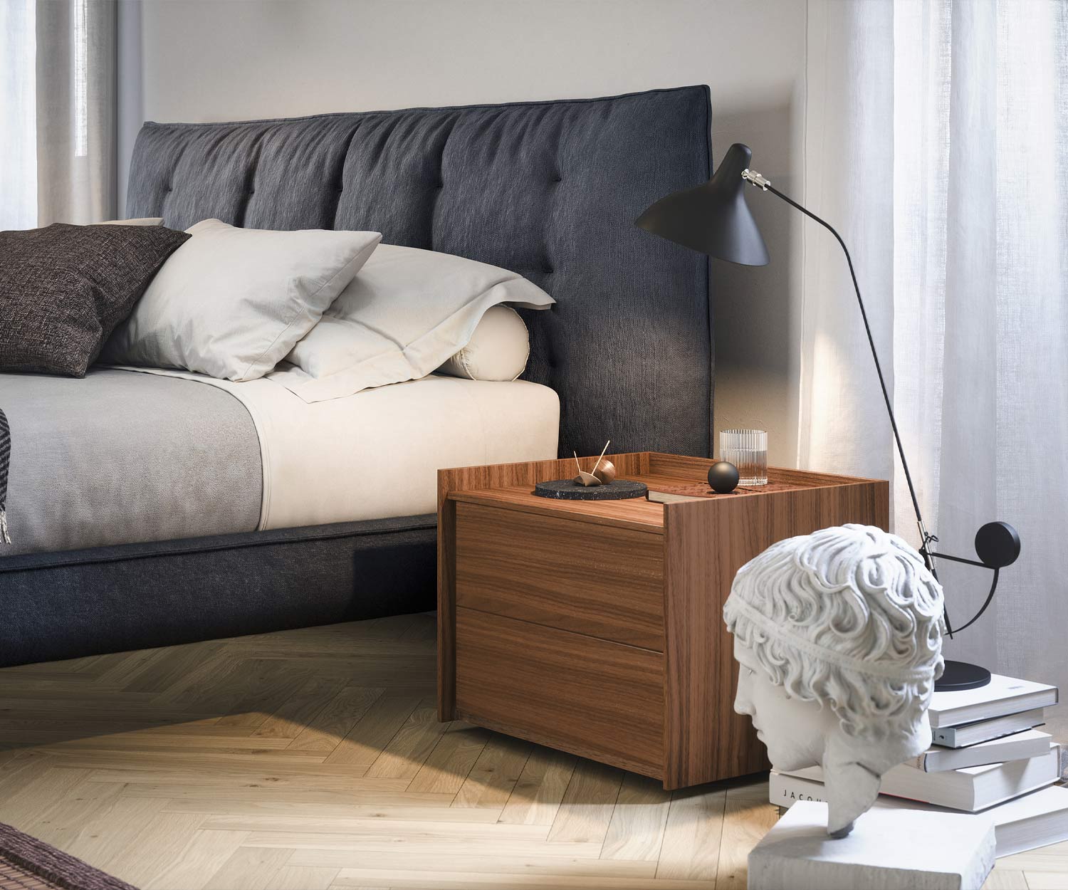 Der Nachttisch Sly ist oben in den Abbildungen in der Farbe Walnuss Noce Canaletto N03 Holzfurnier zu sehen.