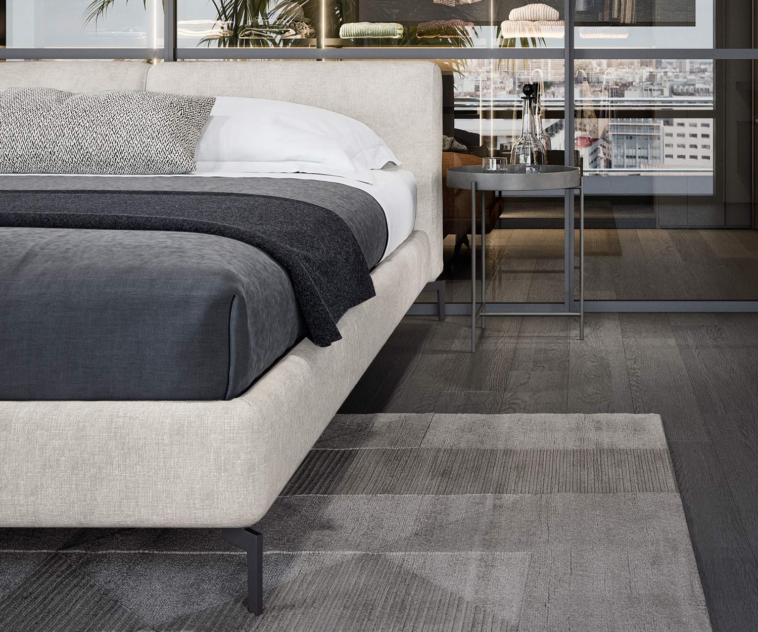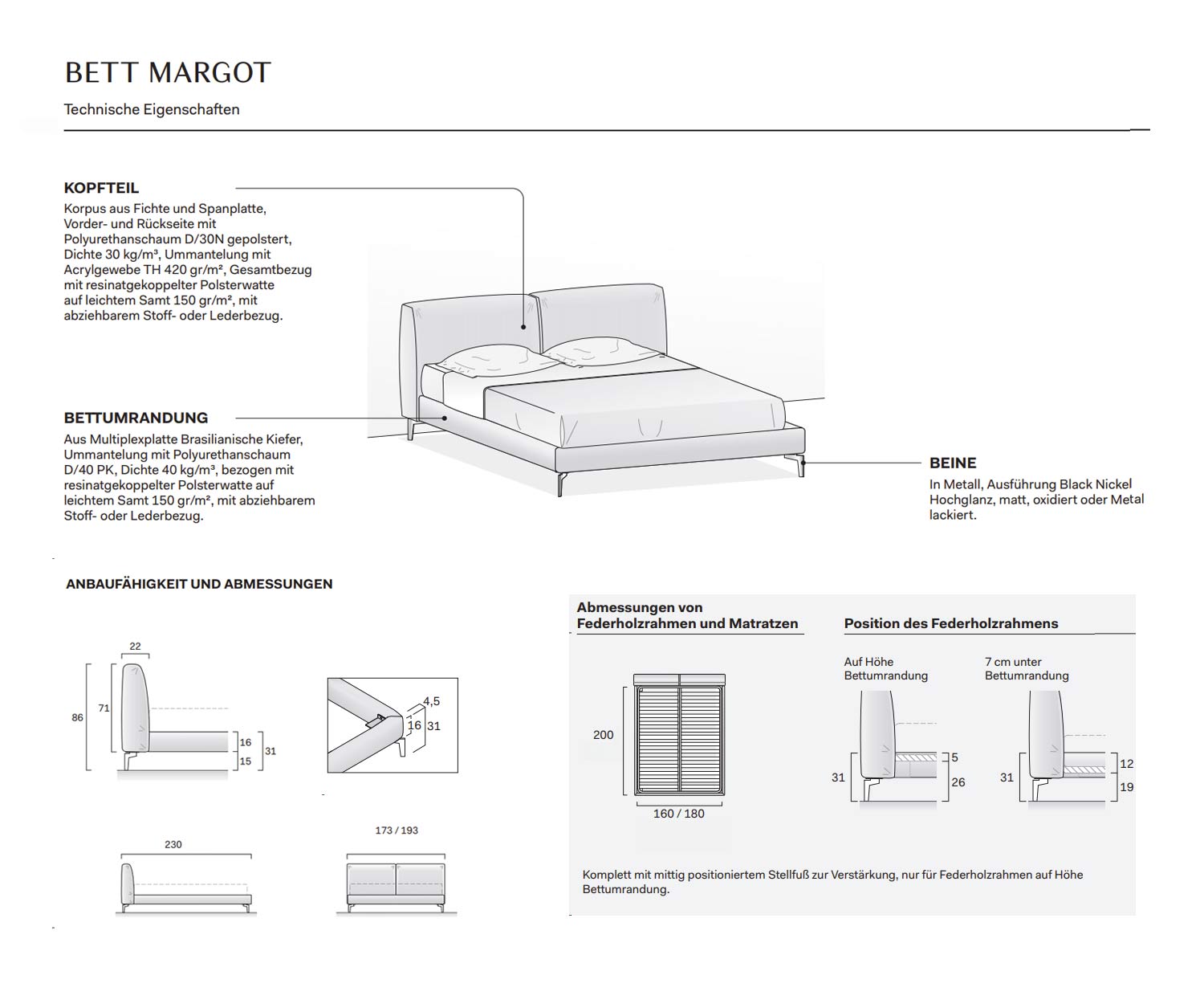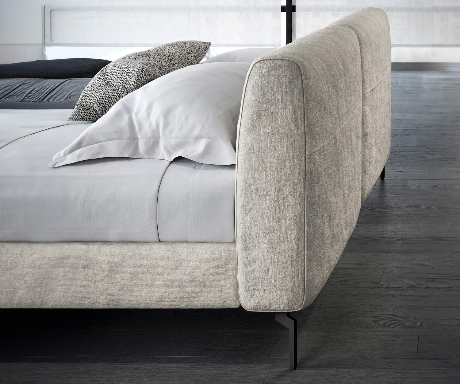 Das Design Polsterbett Margot wird von Novamobili in Italien produziert. Jedes Bett wird nur auf Bestellung für Sie hergestellt. Die Besonderheiten beim Design Bett Margot sind die schmalen Metallfüße und die runde Polsterung um das Bett. Durch die kleinen Füße wirkt das Bett besonders leicht und schwebend.
