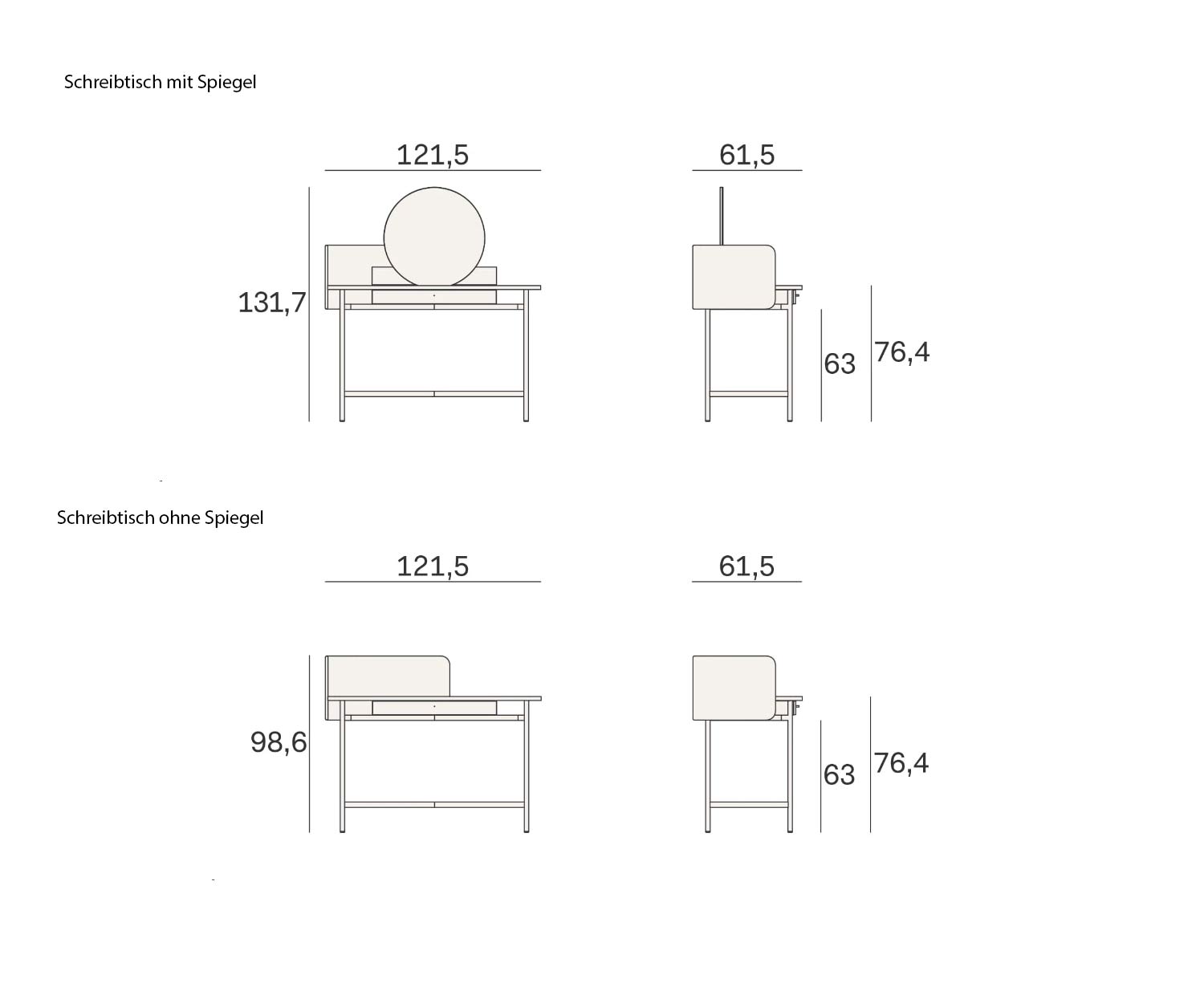 Der Sekretär Ninfea verfügt über eine Schublade unter der Tischplatte. Bei der Ausführung mit Schminkspiegel sind zusätzlich Ablagekästchen hinter dem Spiegel erhältlich.