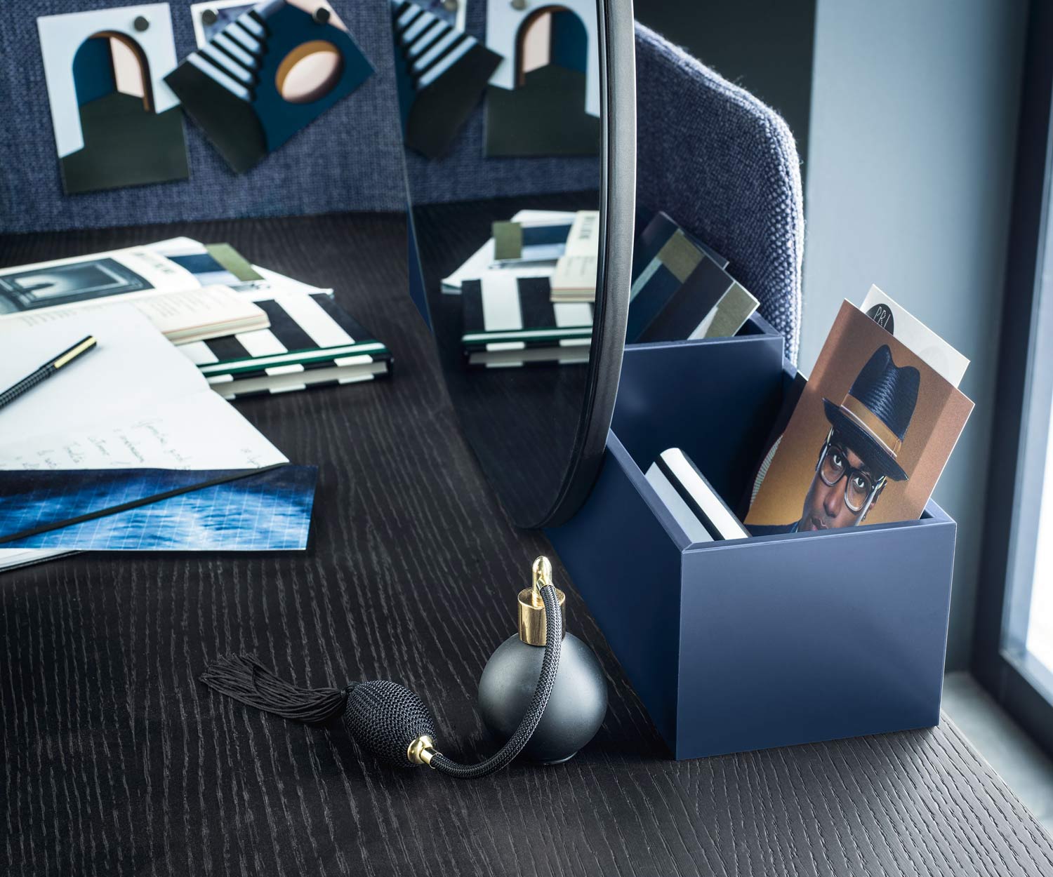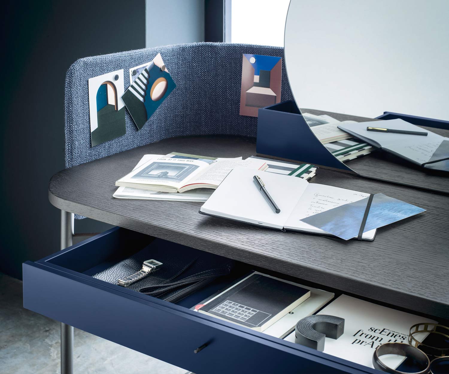 Die Schublade ist erhältlich in Matt Blau Blu Notte mit dem Sichtschutz Stoffbezug in Dunkelblau Florence 05. Bei der Schreibtisch Ausführung mit Sichtschutz Stoffbezug in Beige Florence 08 ist die Schublade Matt Schwarz Nero Grafite lackiert.