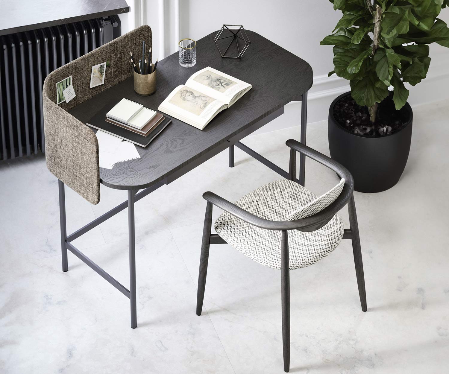 Der Ninfea Schreibtisch besteht aus einer Tischplatte in Carbon Eiche Schwarz. Das Tischgestell ist brüniert und matt lackiert in Schwarz Nero Grafite.