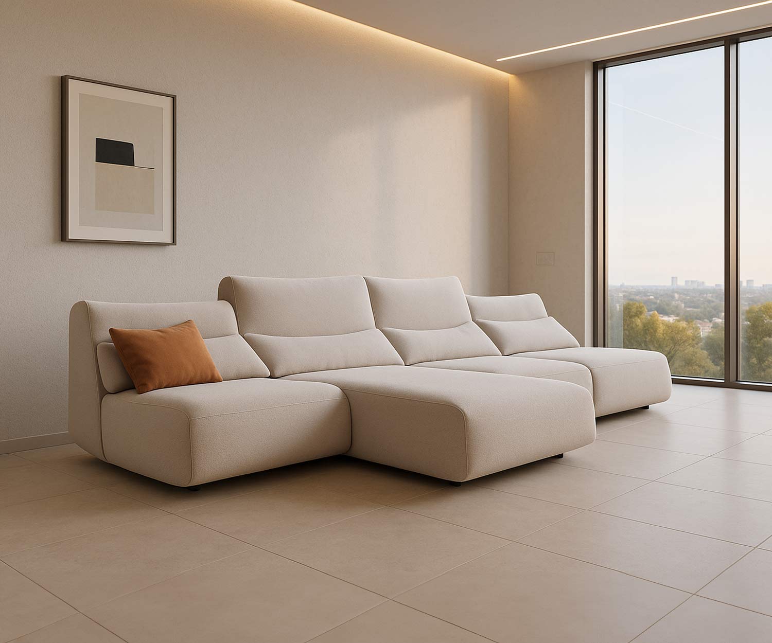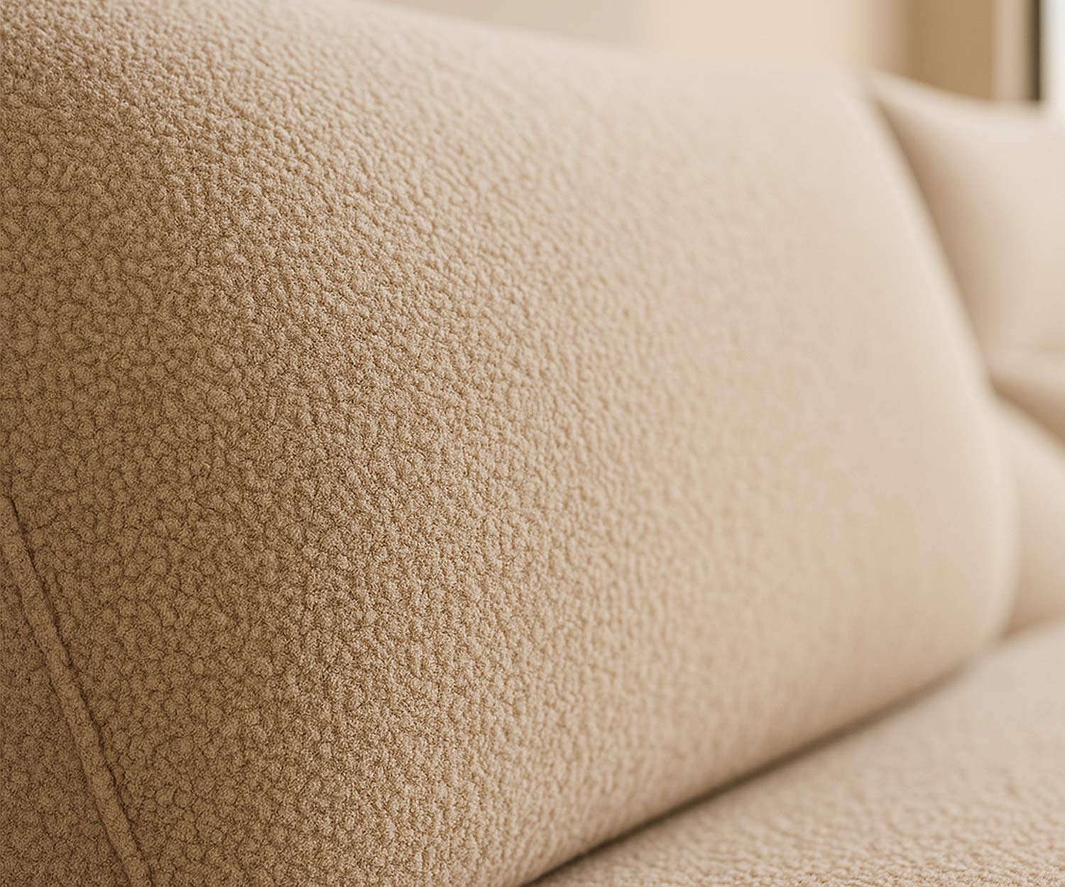Für höchsten Sitzkomfort sorgt die Polsterung aus Kaltschaum und Polyesterwatte, während die Kissen mit einer Mischung aus Kaltschaum und Federn für perfekte Weichheit und stützende Festigkeit sorgen. Der abnehmbare Stoffbezug aus Bouclé macht die Möbelpflege besonders einfach.