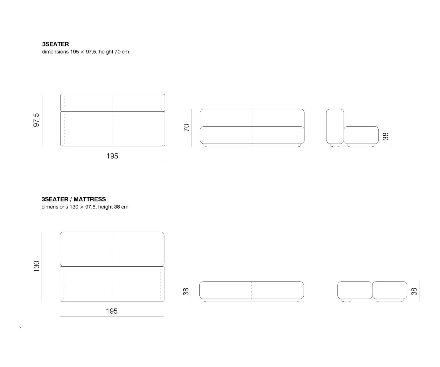 B 195 cm / H 70 cm / T 97,5 cm als 3-Sitzer