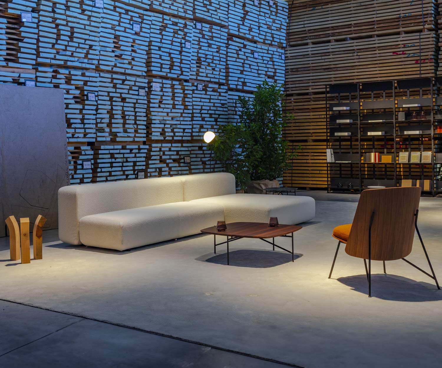 Der Bezugsstoff des Klaster Sofas ist erhältlich in Bouclé Beige (Orsetto 01/02), Hellgrau (Orsetto 02/22) und Dunkelgrau (Orsetto 98/21).
